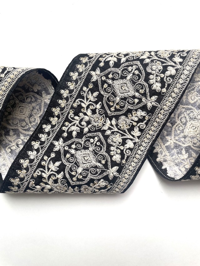 ◆50cmカット済◆インド花柄刺繍リボン・ブラック