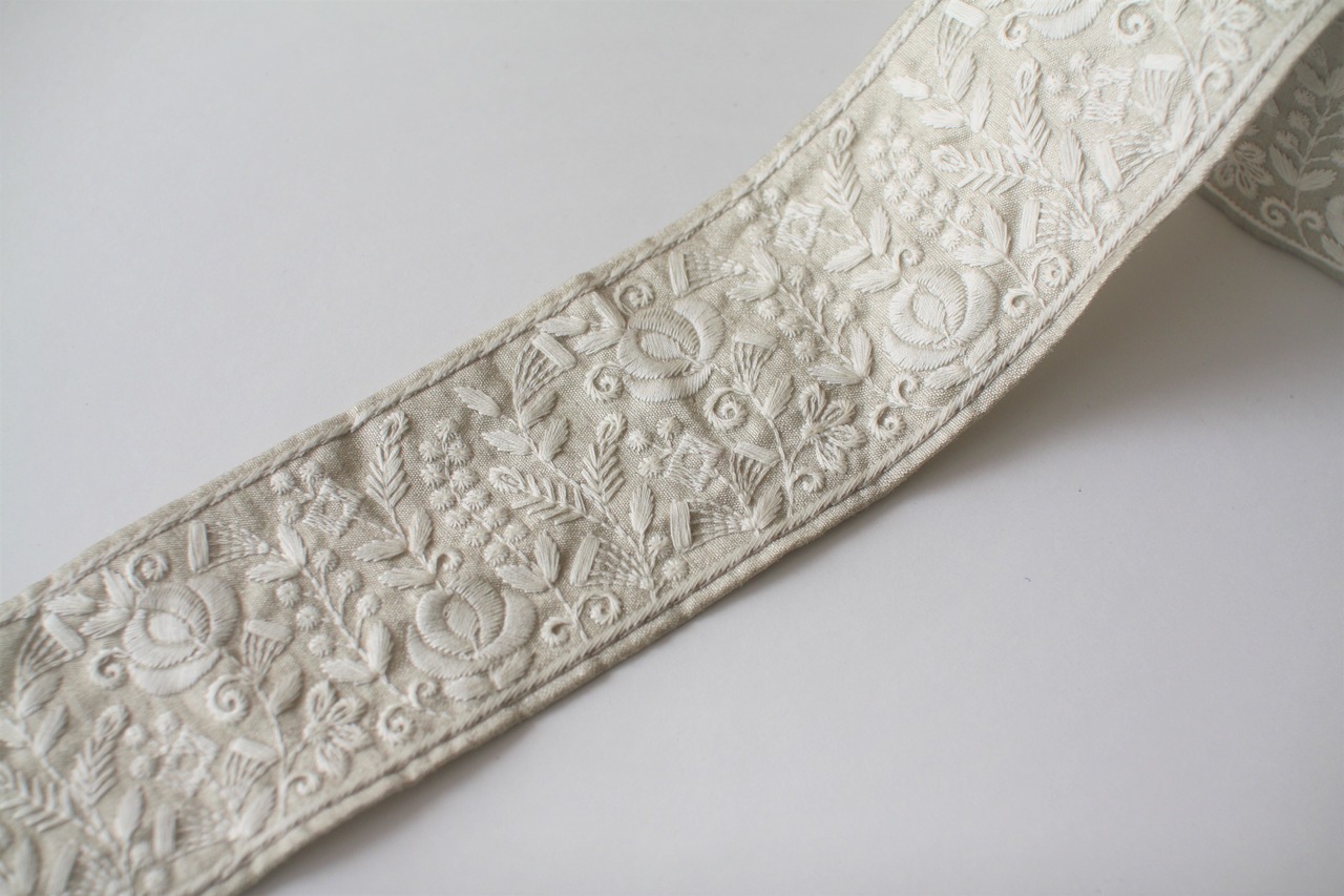 ◆1mカット済◆インド花柄刺繍リボン・シルバーグレー
