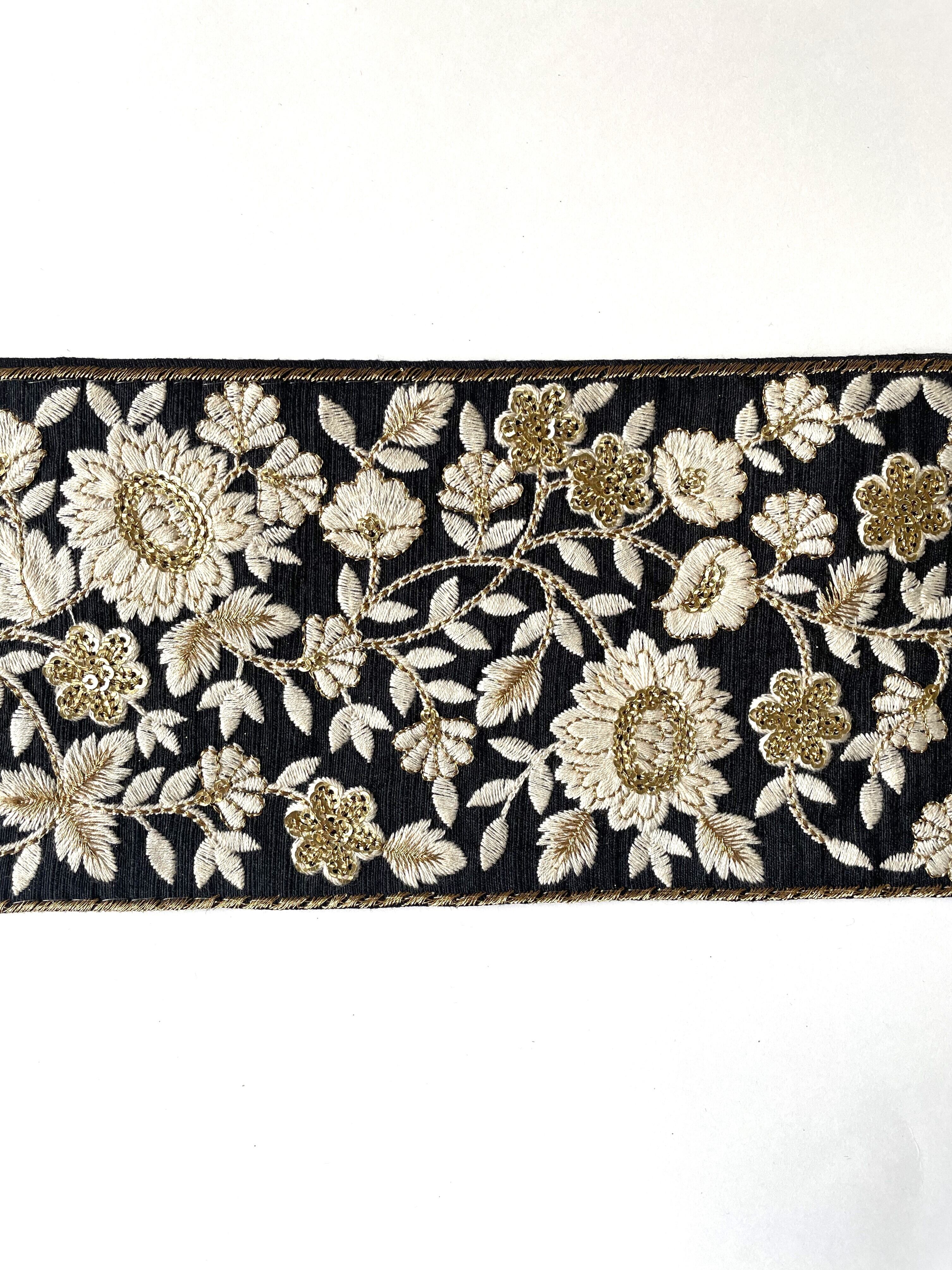 ◆95cmカット済◆インド花柄刺繍リボン・ブラック
