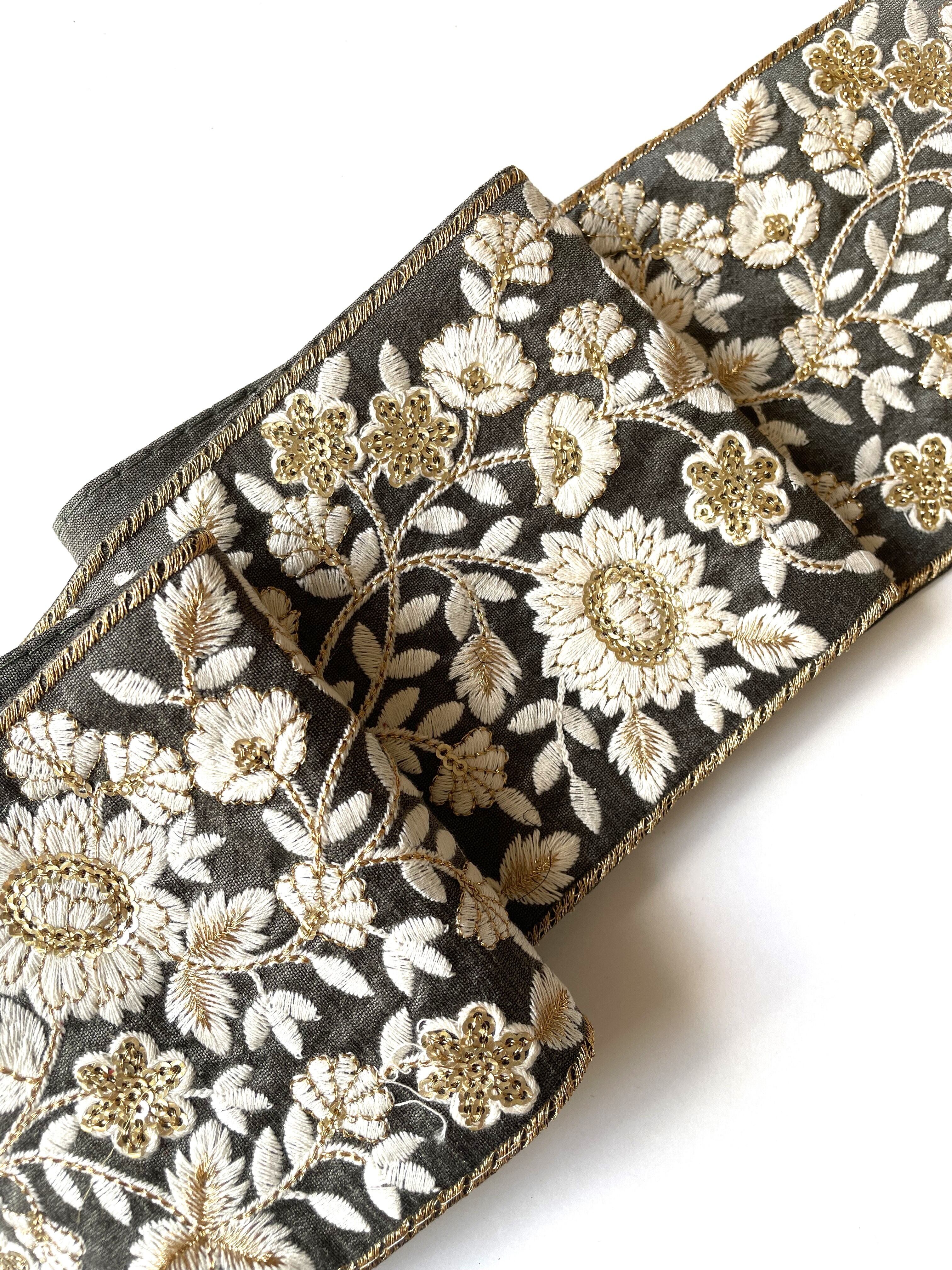 ◆1mカット済◆インド花柄刺繍リボン・オリーブ