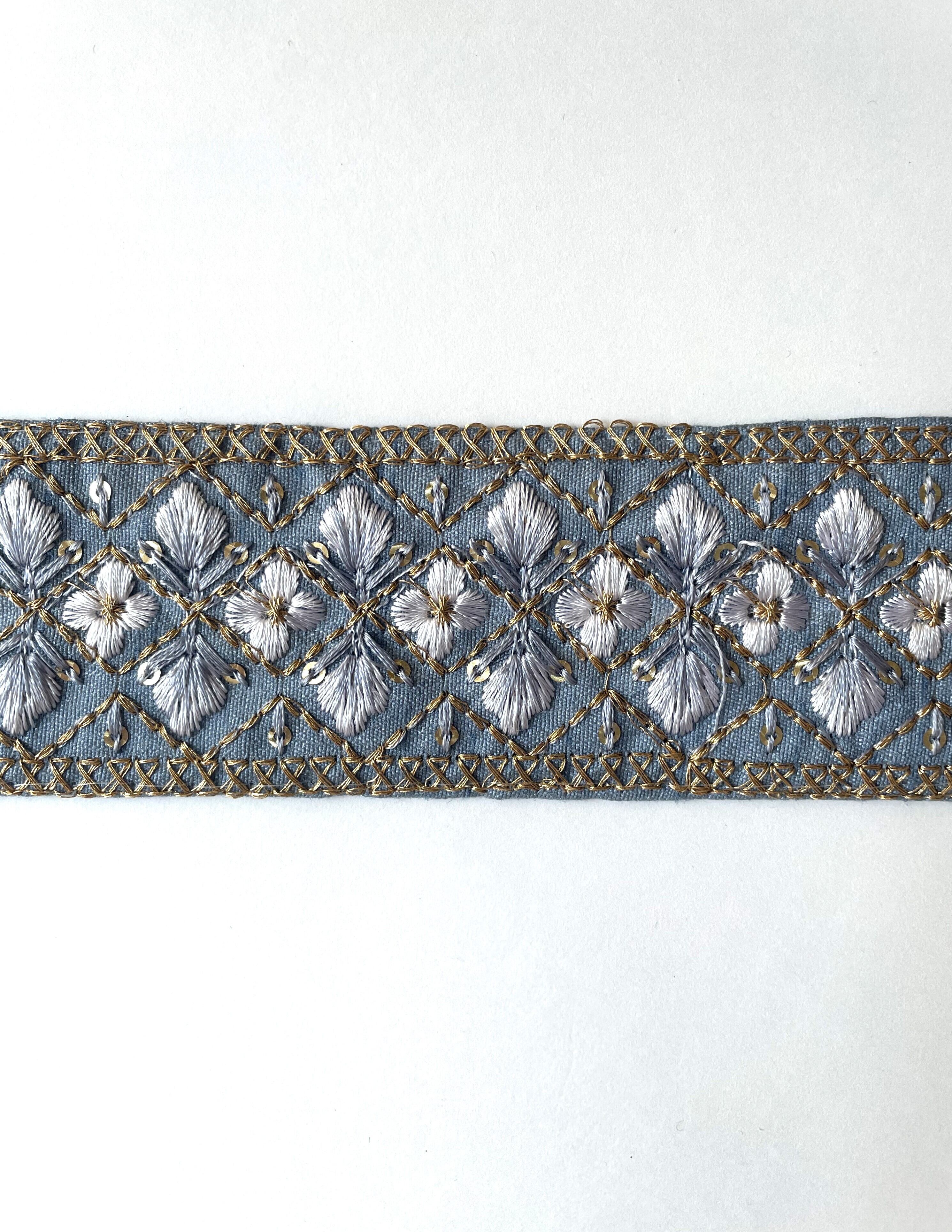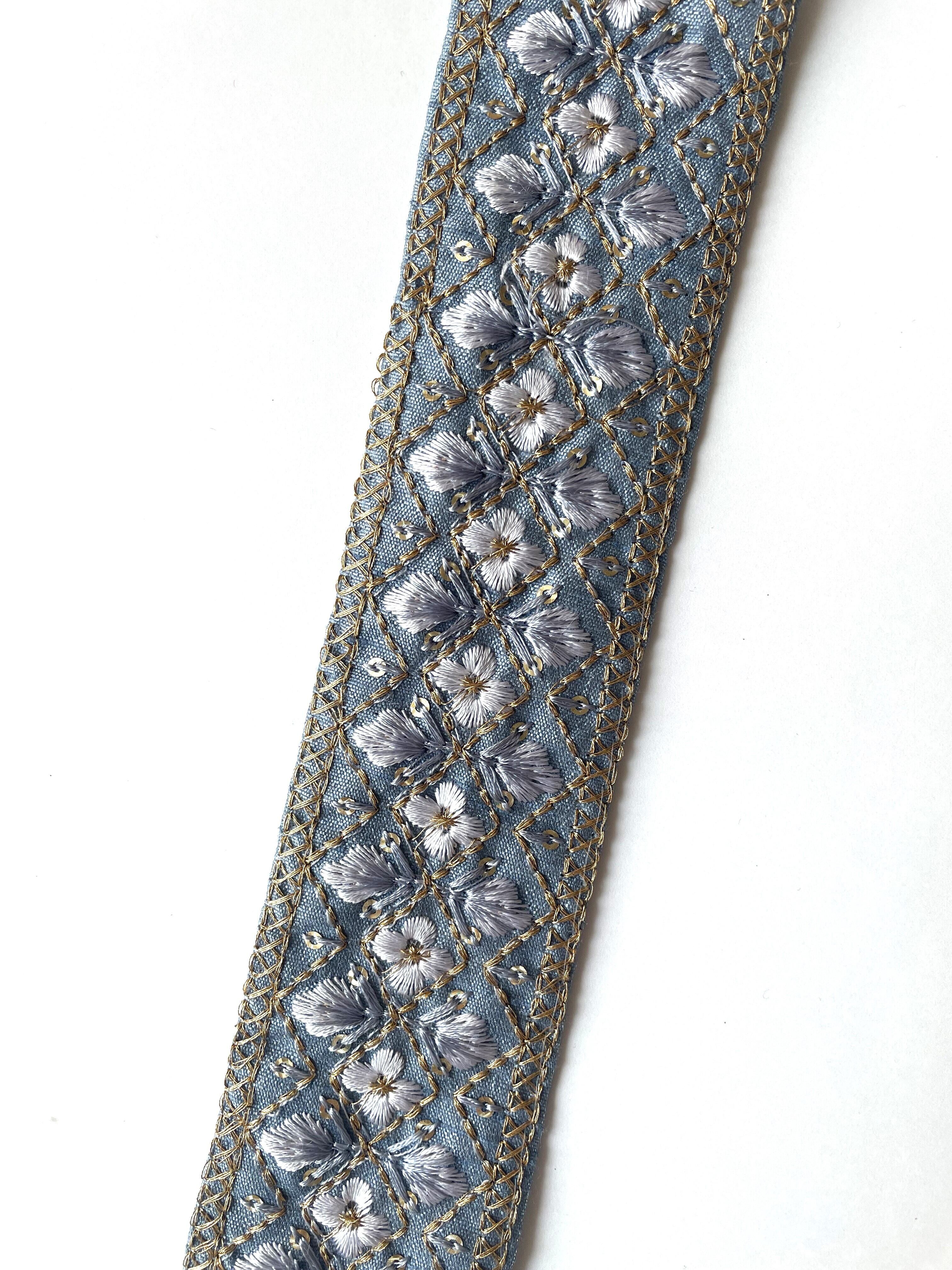 ◆1mカット済◆インド花柄刺繍リボン・サックスブルー