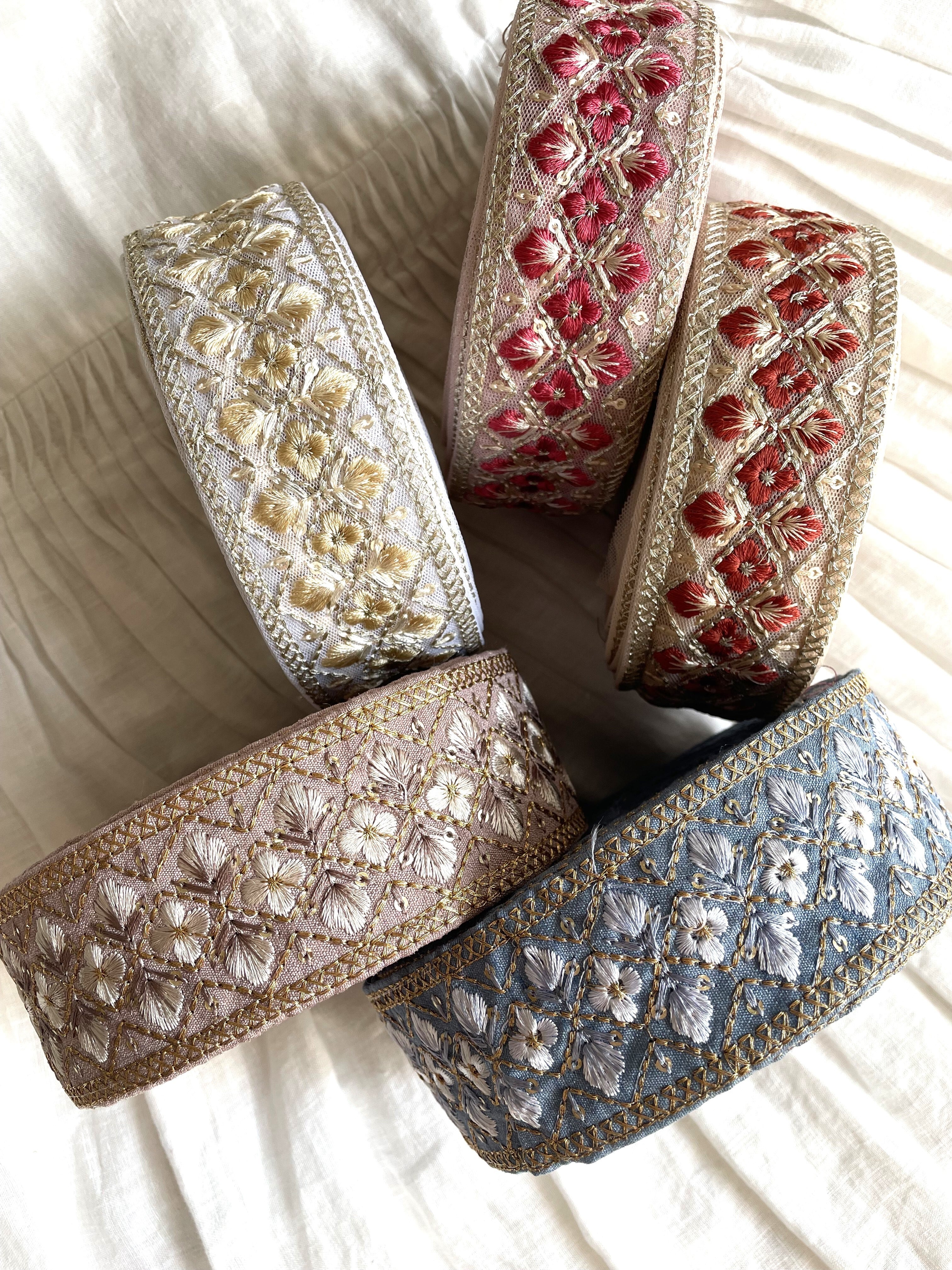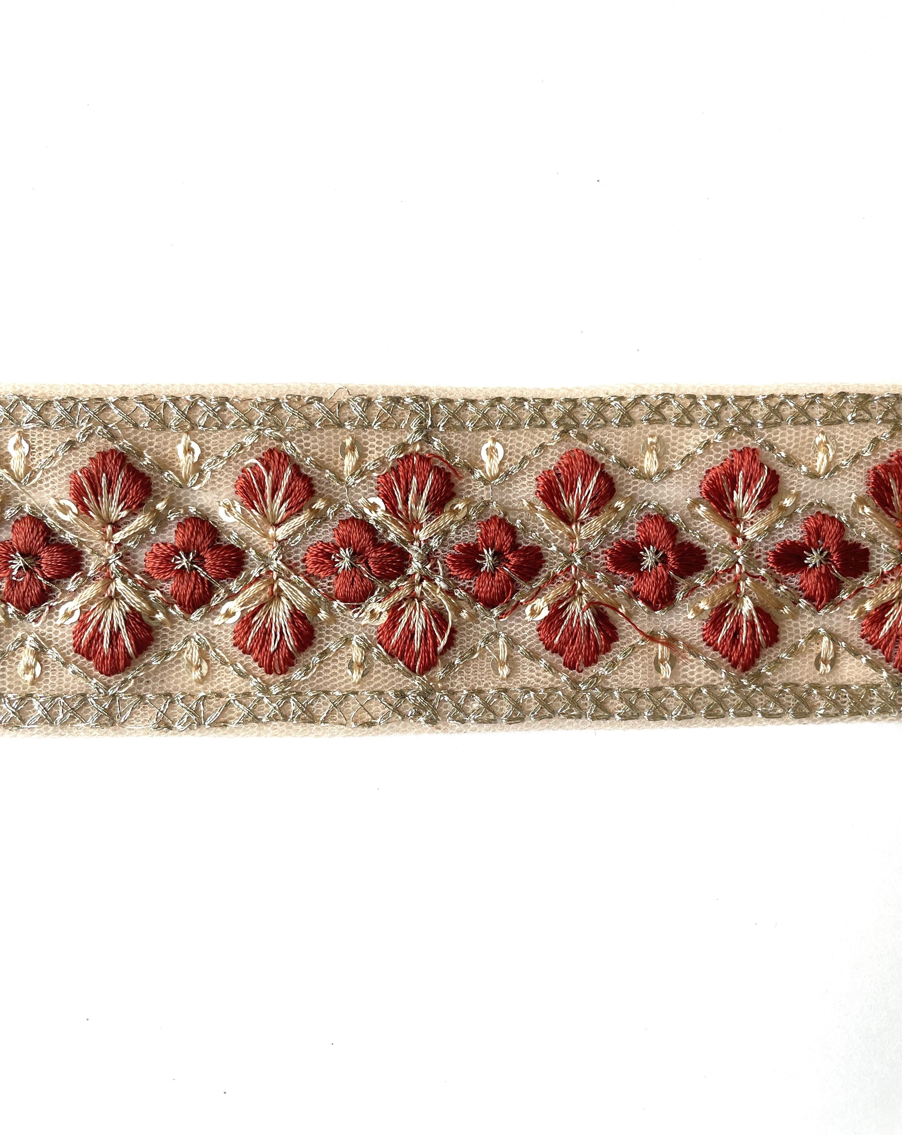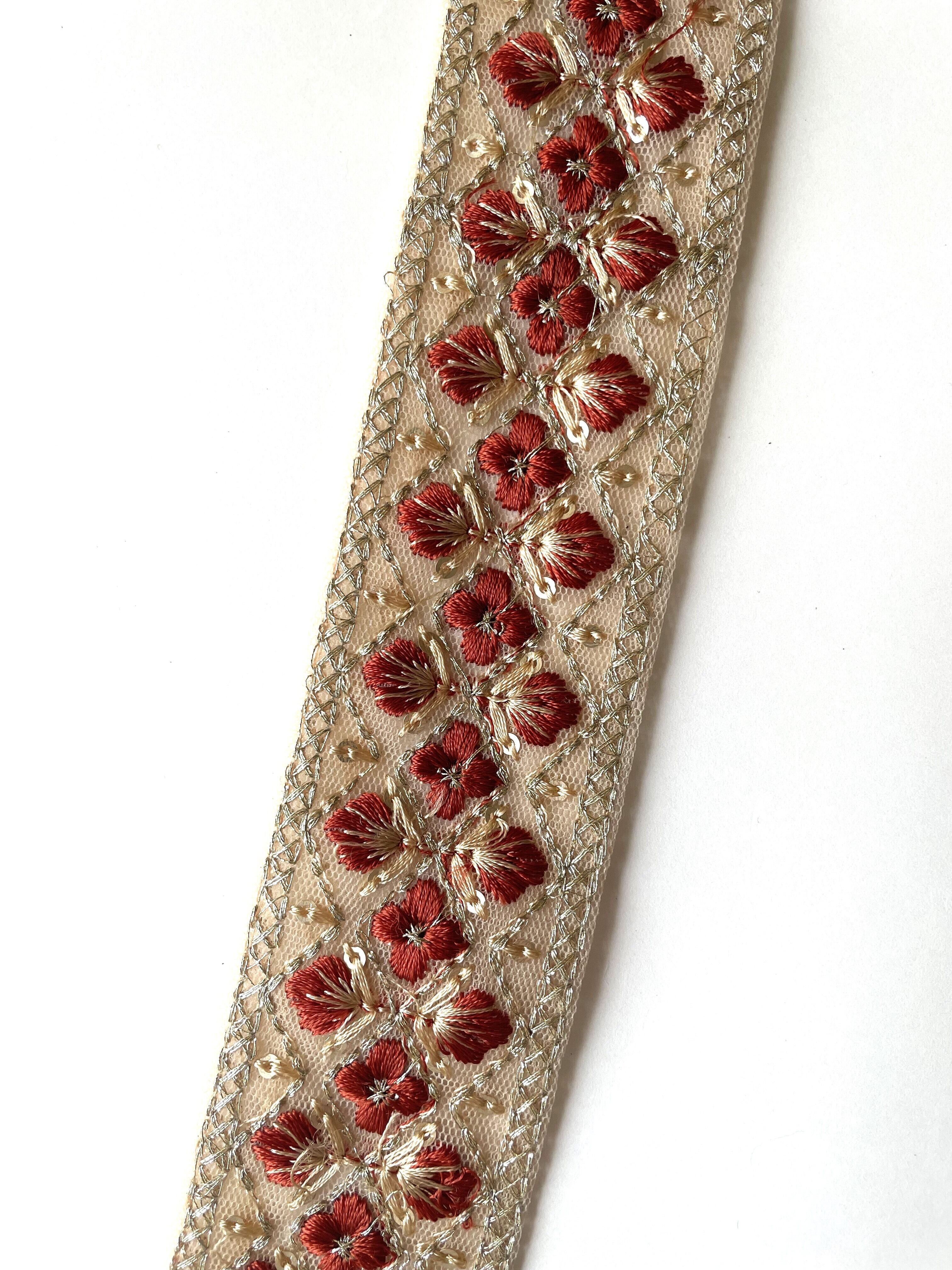 ◆1mカット済◆インド花柄刺繍リボン・レディッシュブラウン