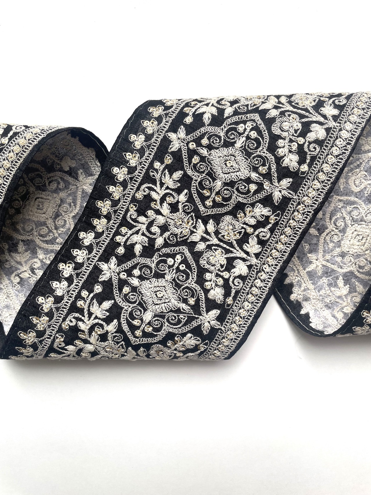 ◆70cmカット済◆インド花柄刺繍リボン・ブラック