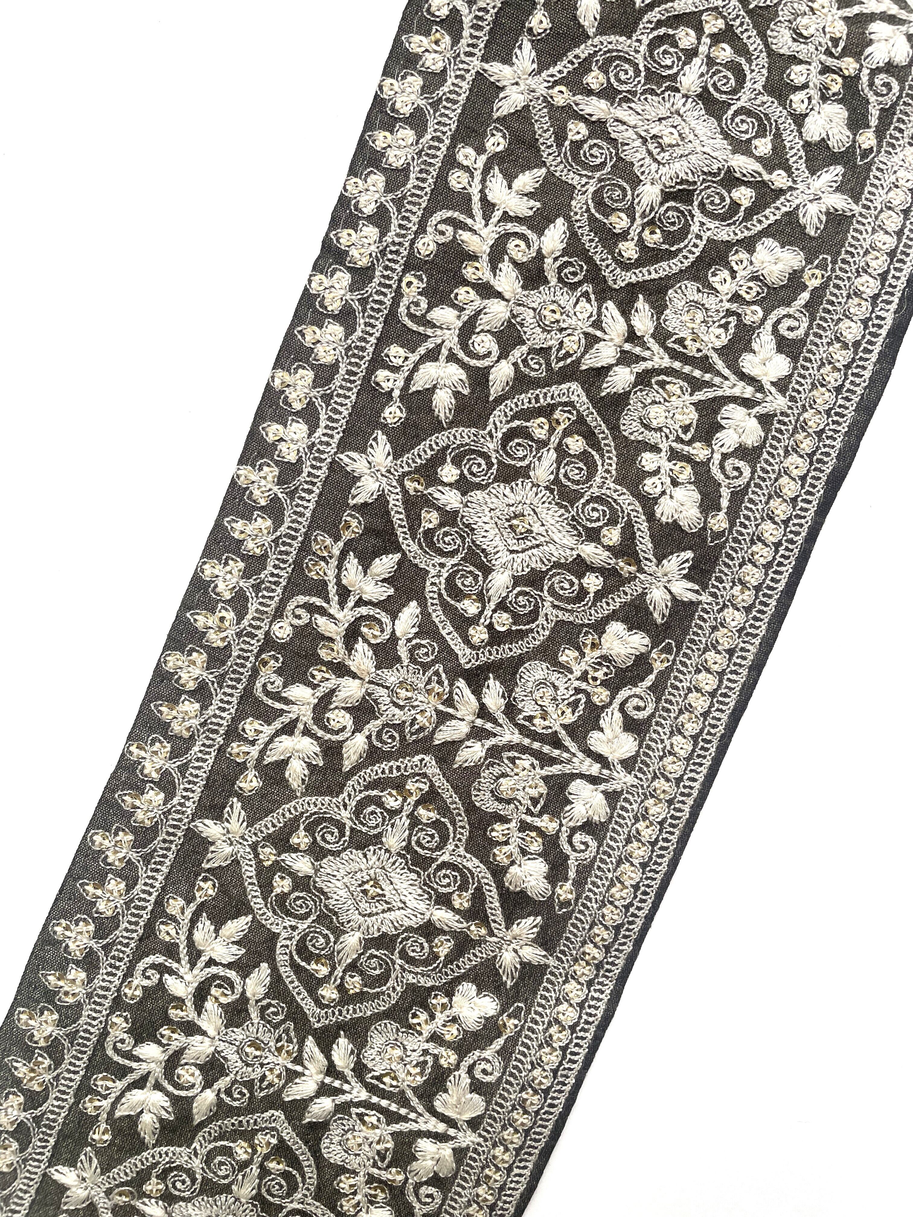 ◆55cmカット済◆インド花柄刺繍リボン・オリーブ