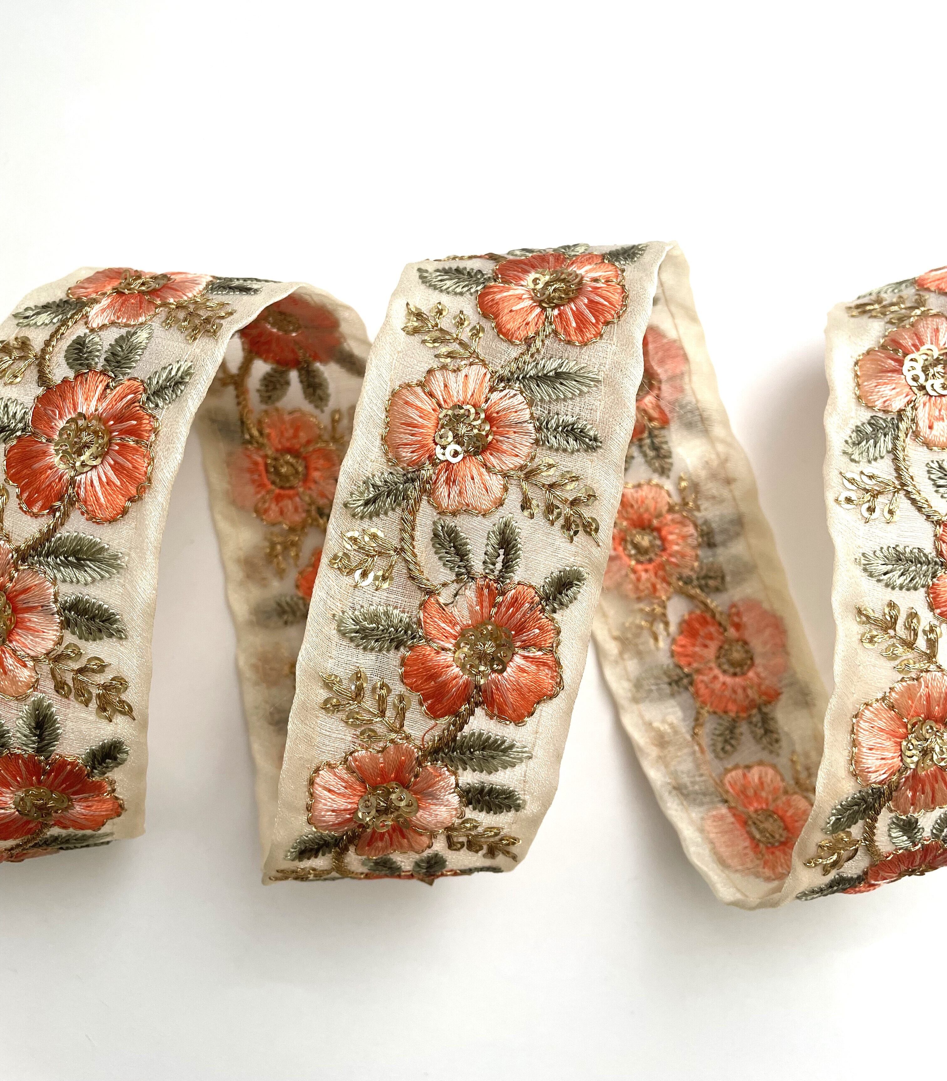 ◆50cmカット済◆インド花柄刺繍リボン・ホワイト