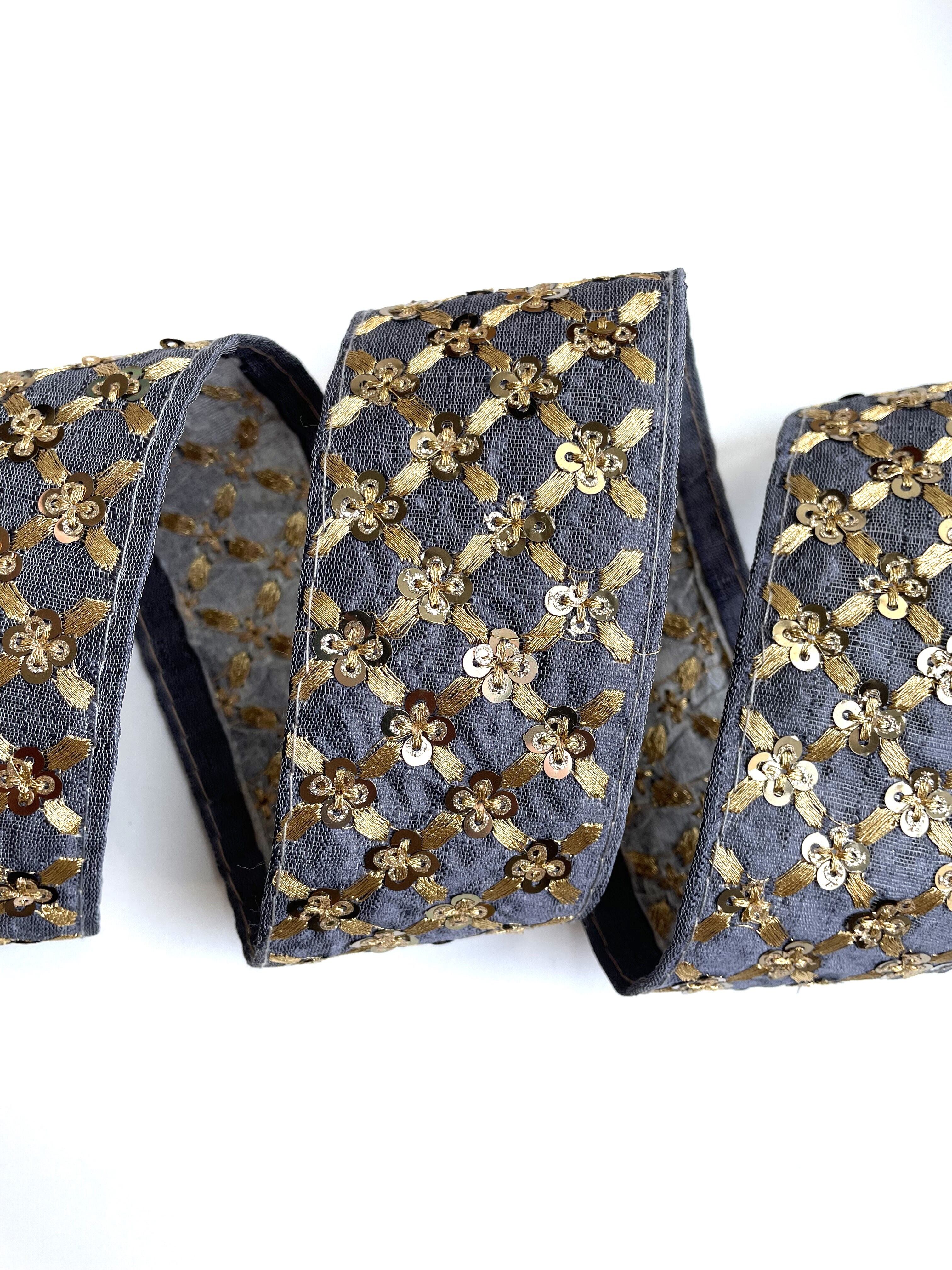 ◆50cmカット済◆インド花柄刺繍リボン・グレー