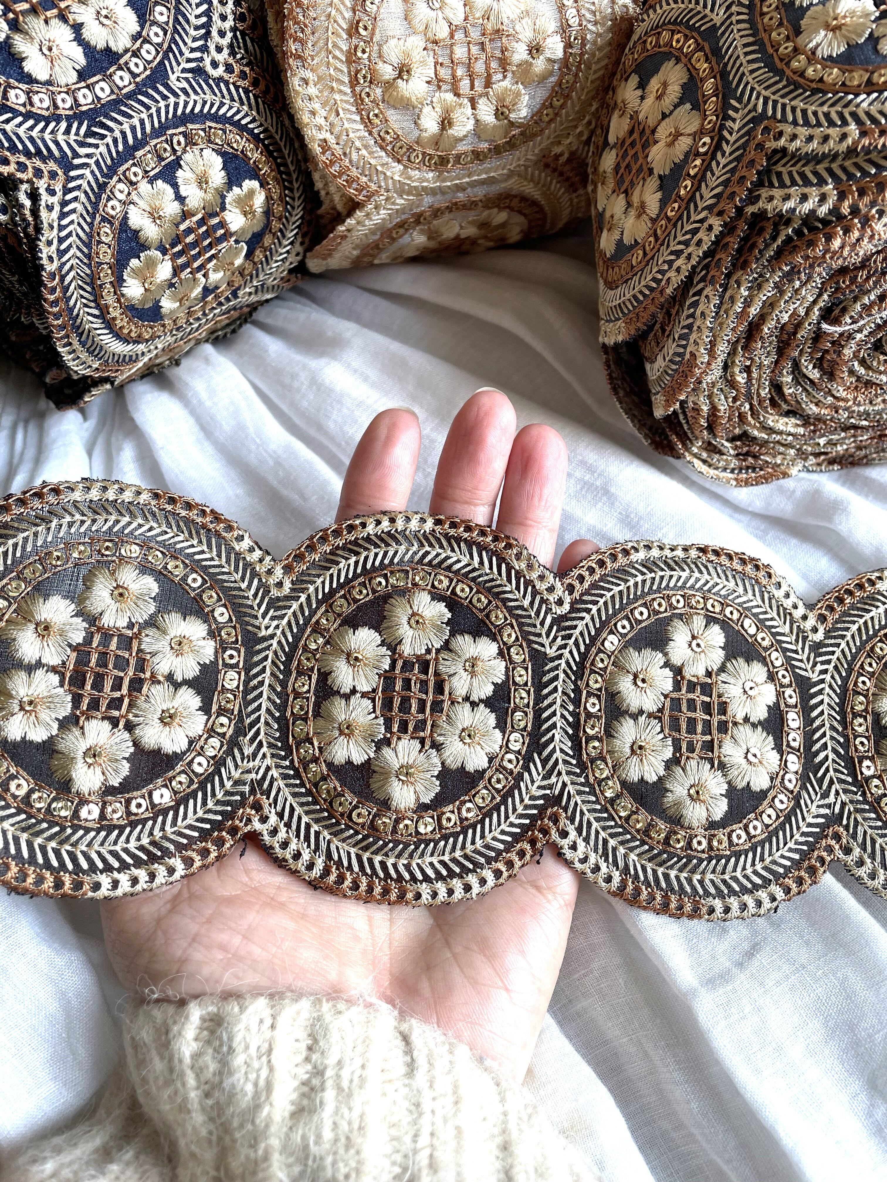 ◆65cmカット済◆チュールラウンド花柄刺繍リボン・ミッドナイトブルー