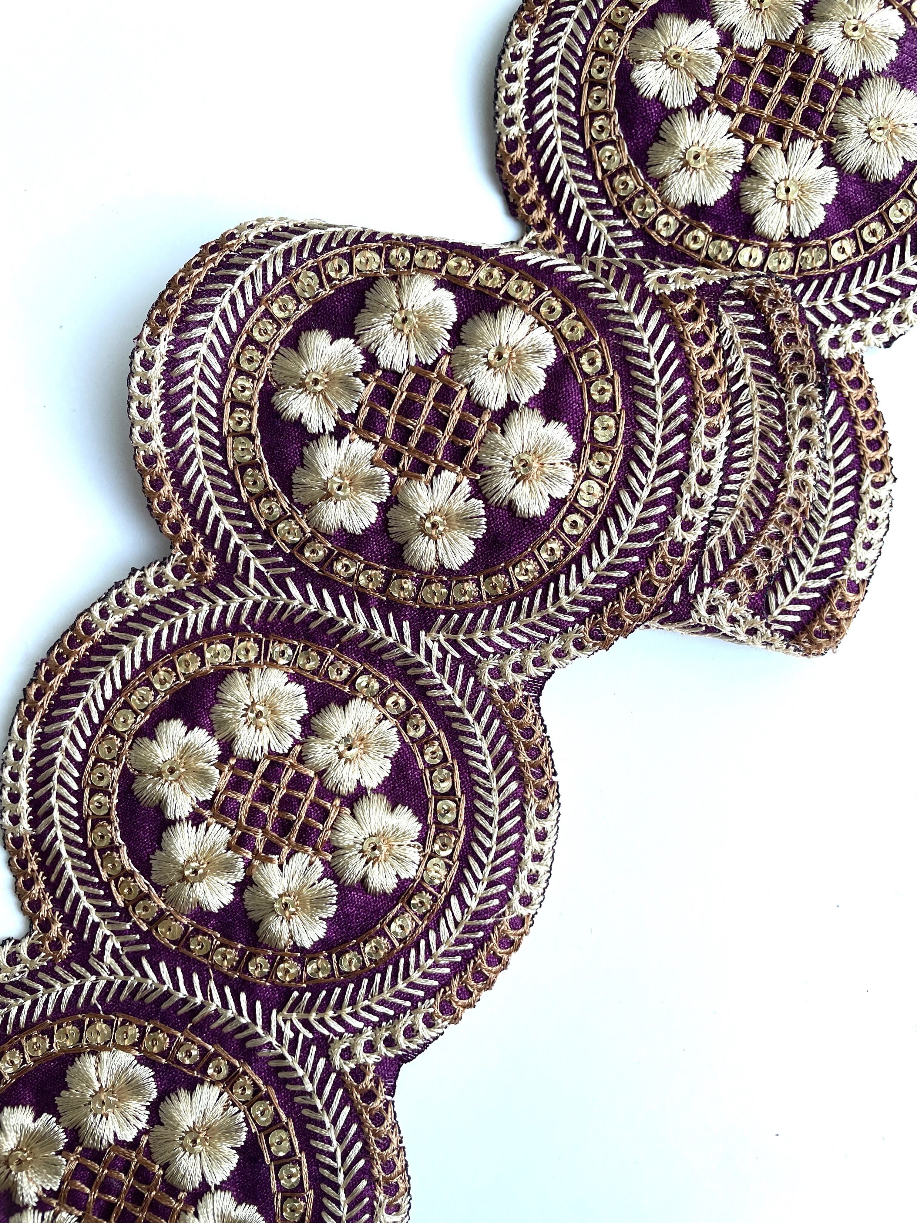 ◆60cmカット済◆チュールラウンド花柄刺繍リボン・マルーン