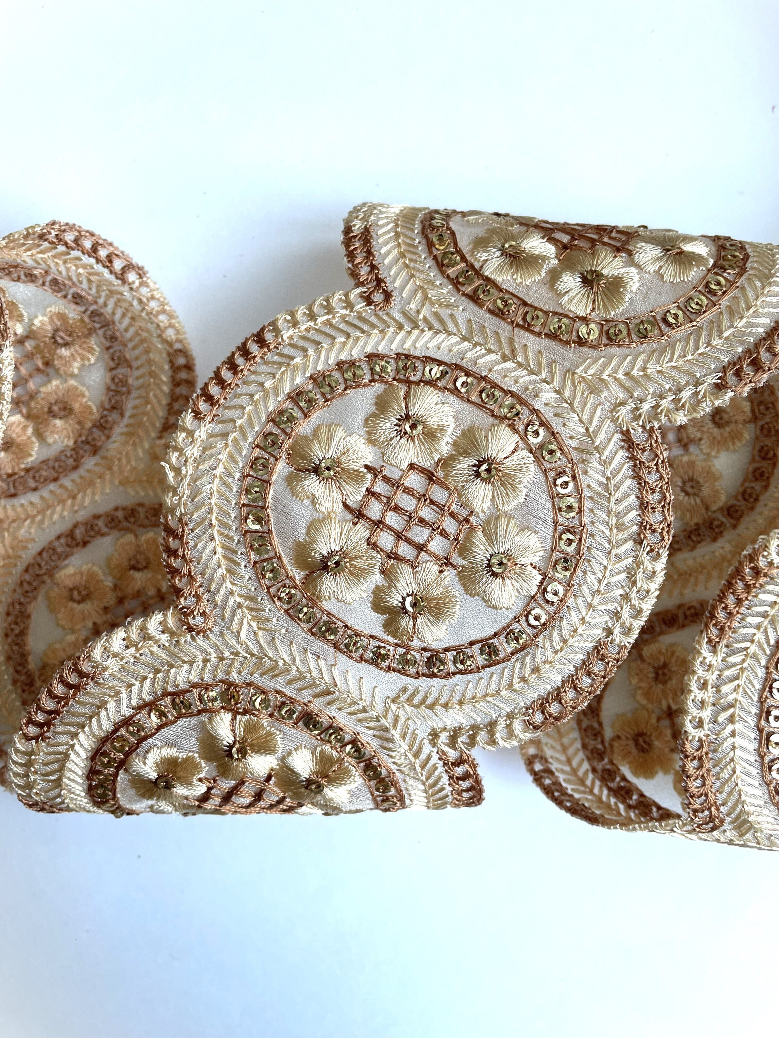 ◆1mカット済◆チュールラウンド花柄刺繍リボン・ベージュ