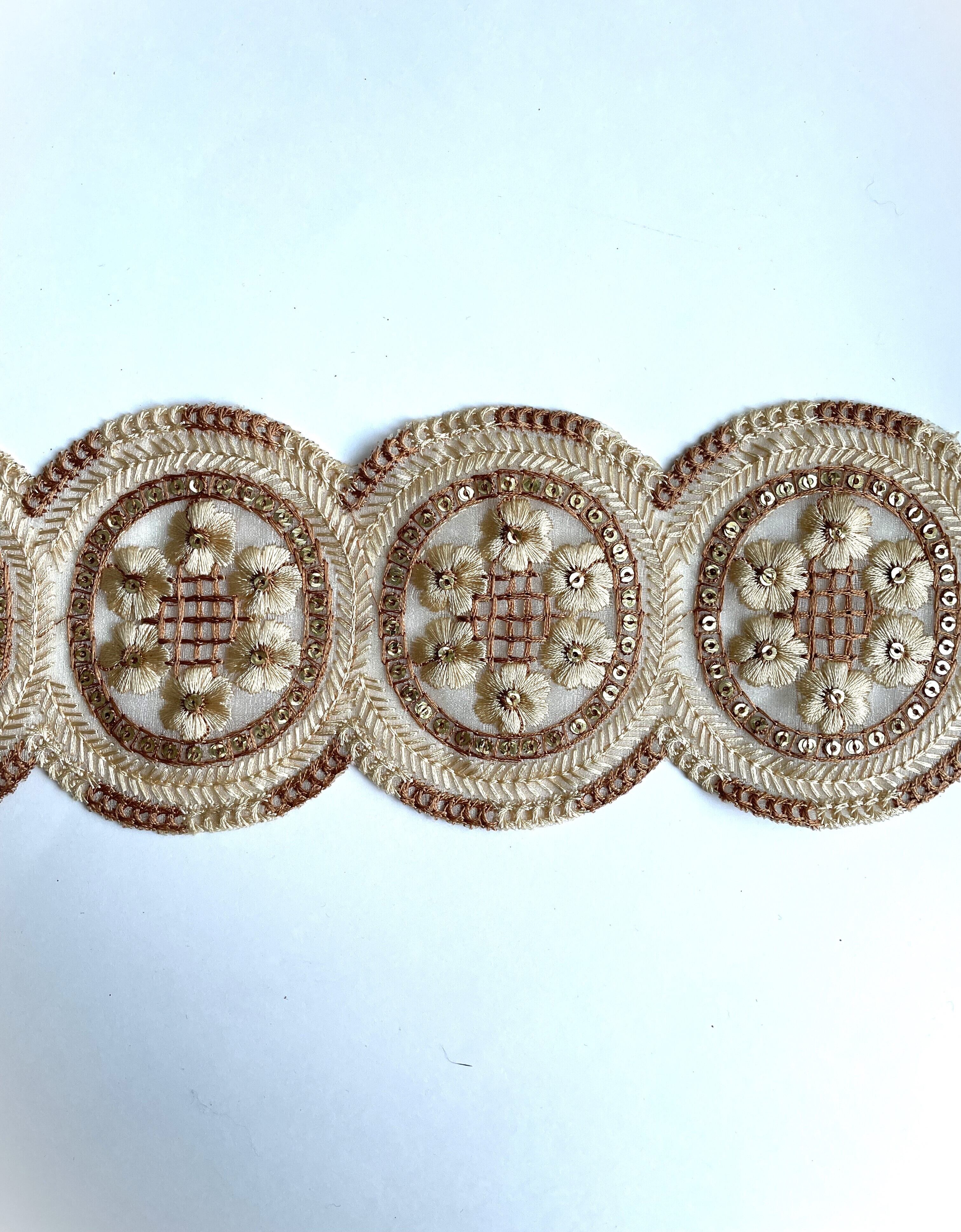 ◆95cmカット済◆チュールラウンド花柄刺繍リボン・ベージュ