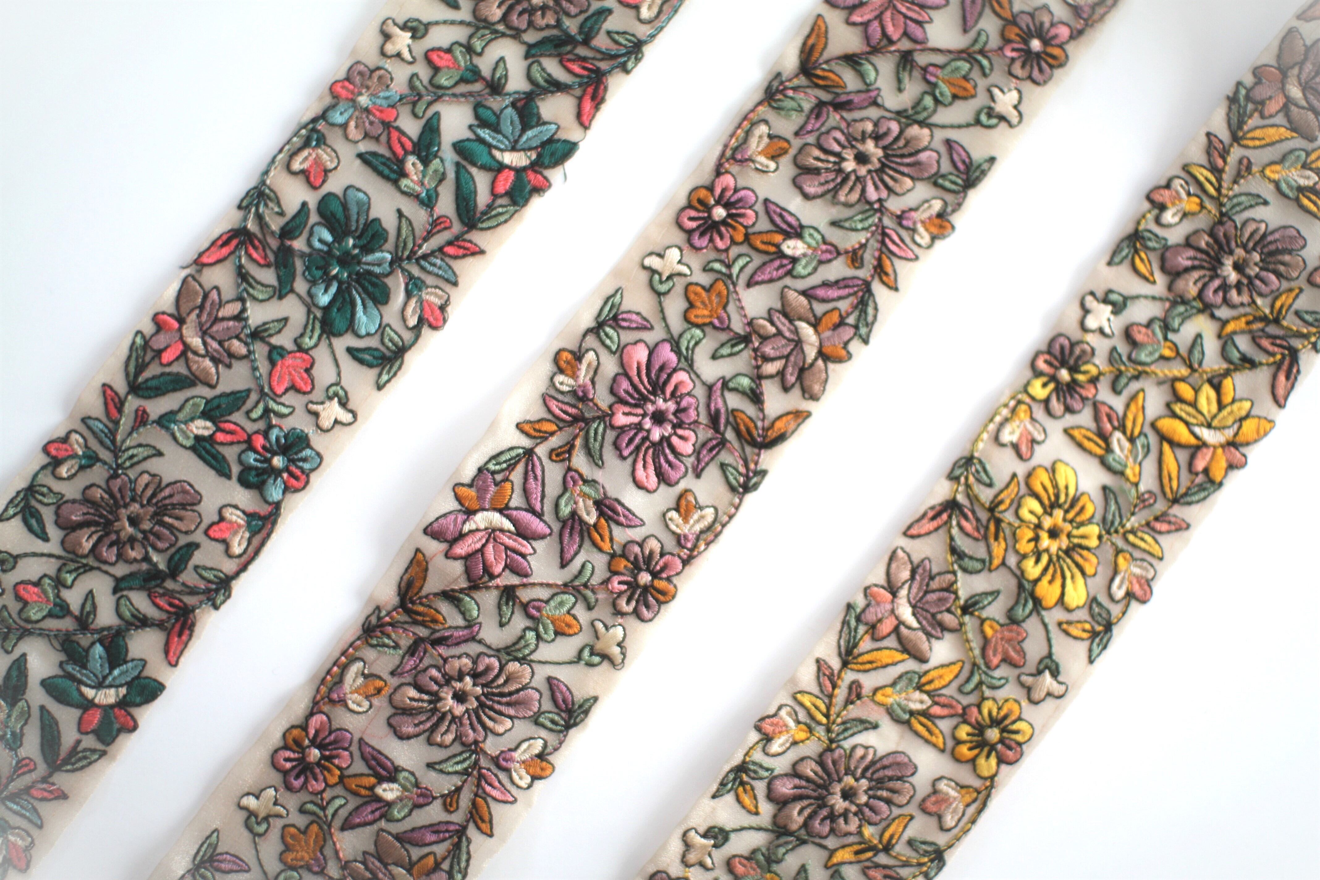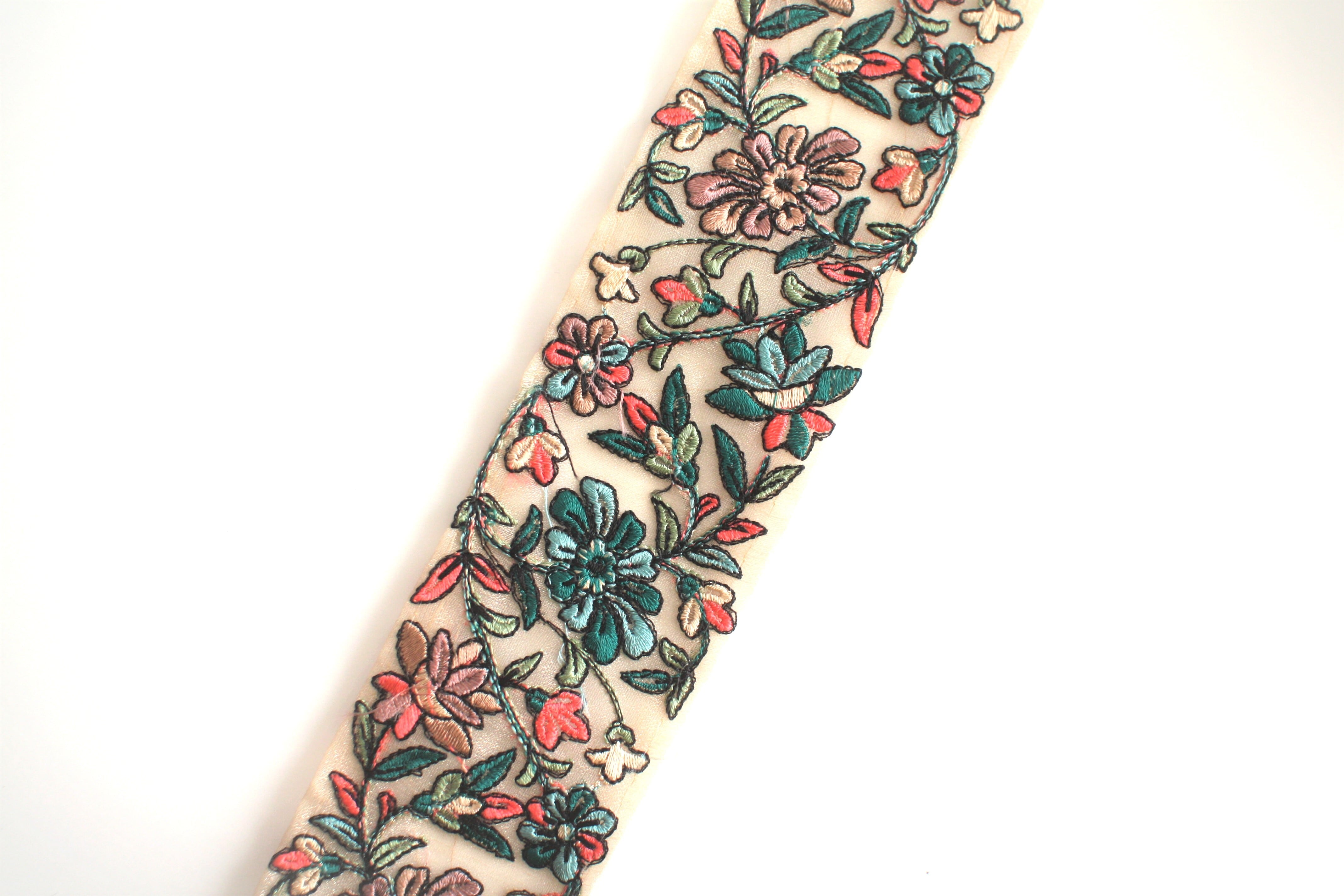 ◆85cmカット済◆インド花柄刺繍リボン・グリーン