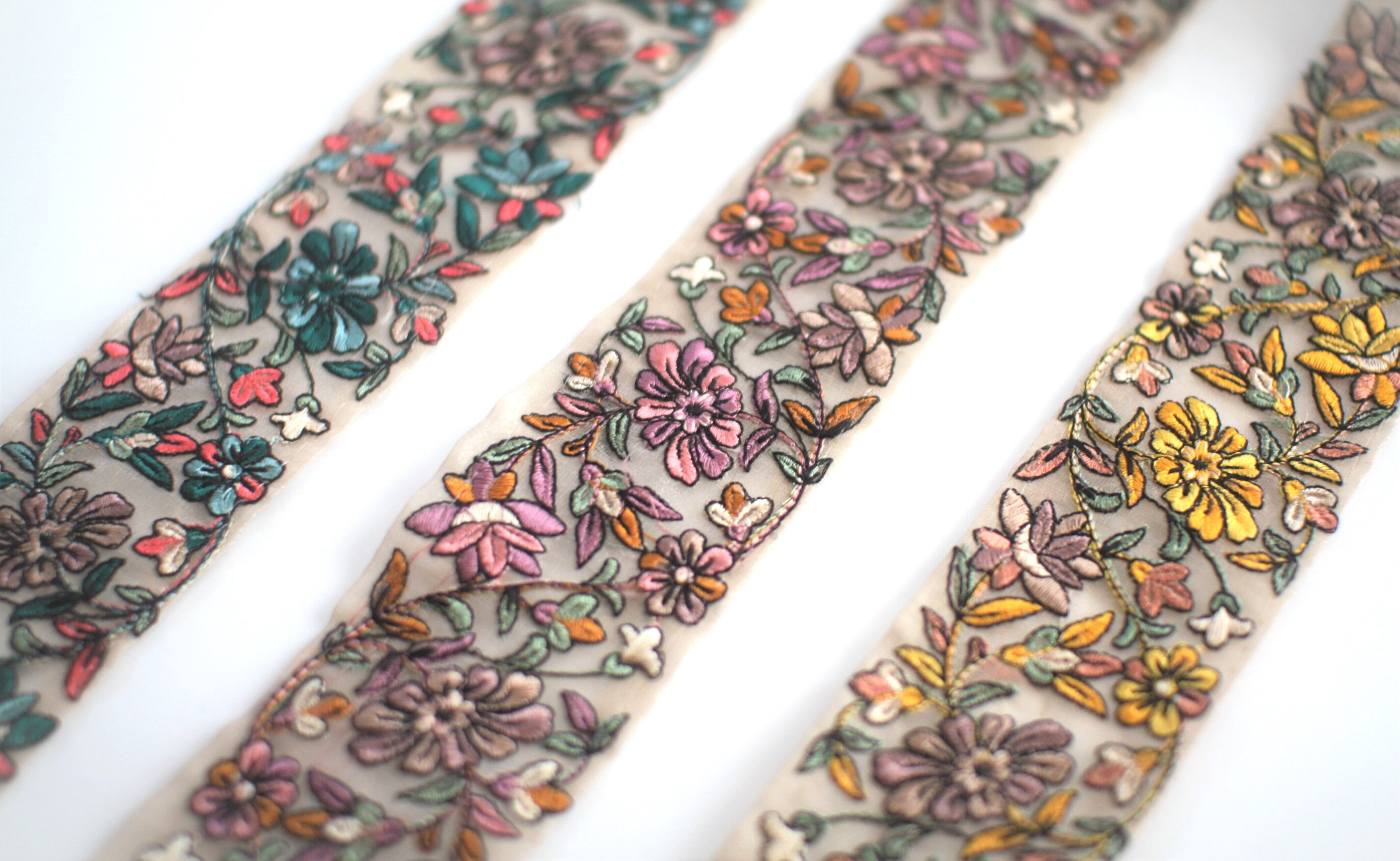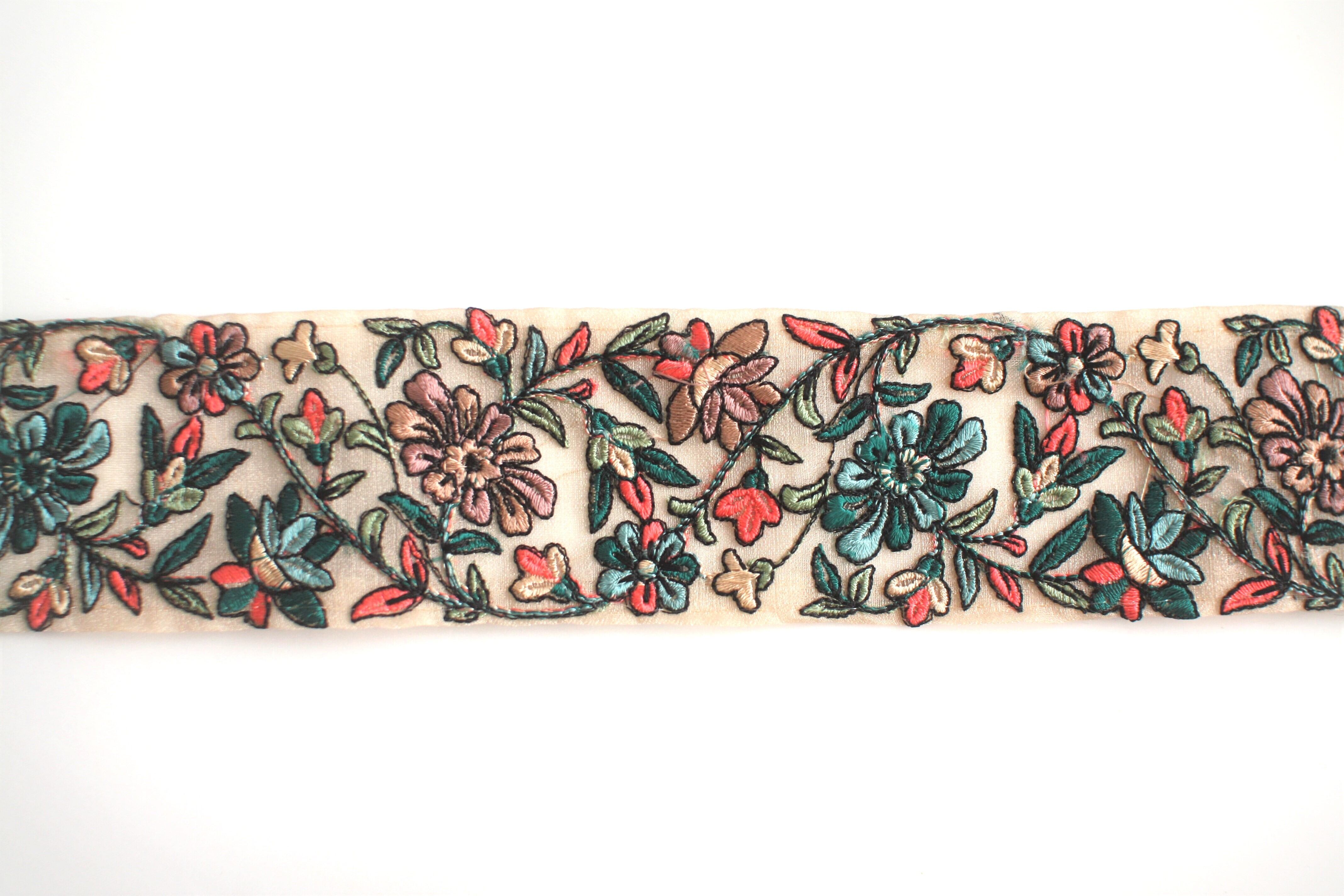 ◆65cmカット済◆インド花柄刺繍リボン・グリーン
