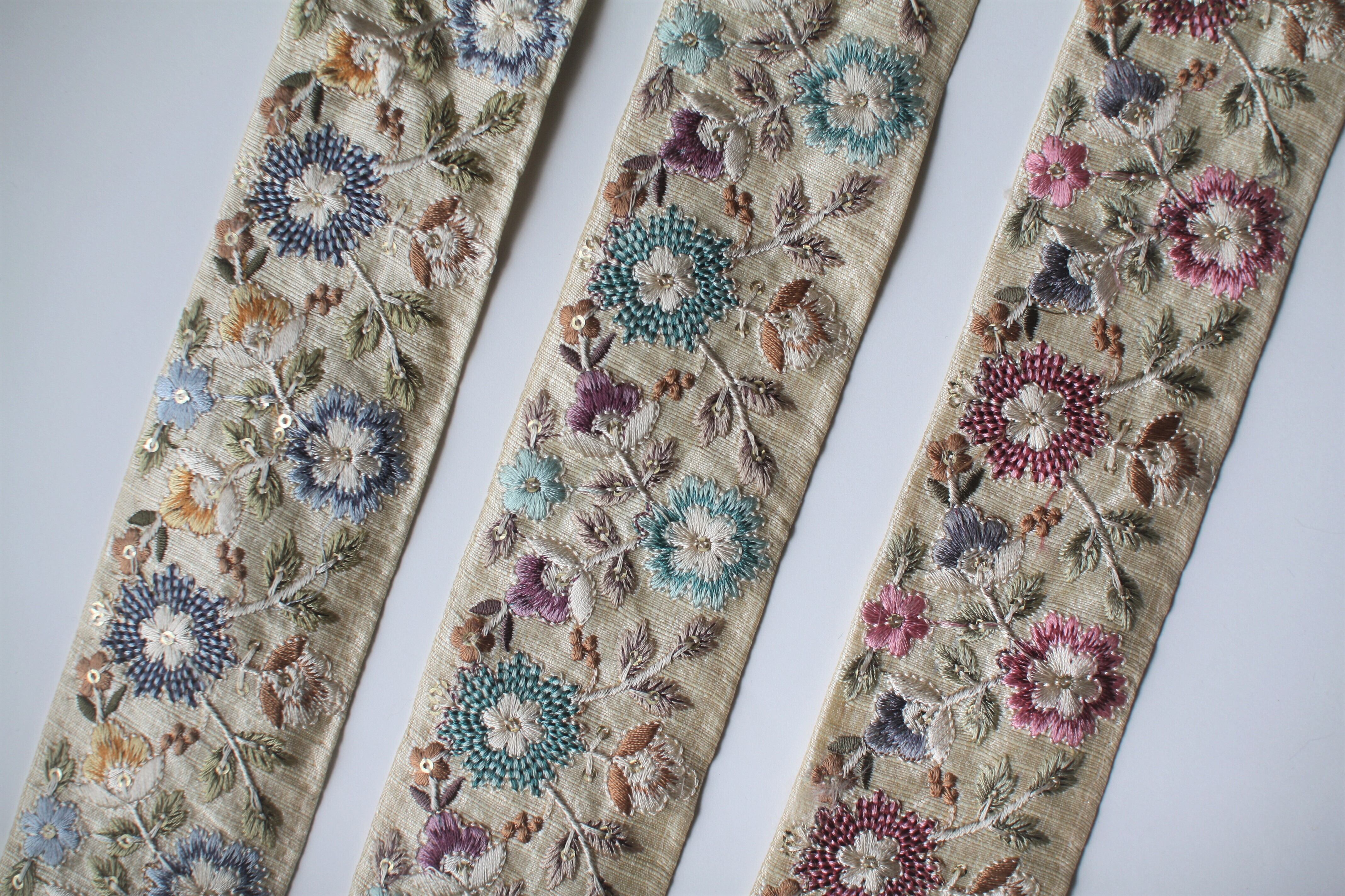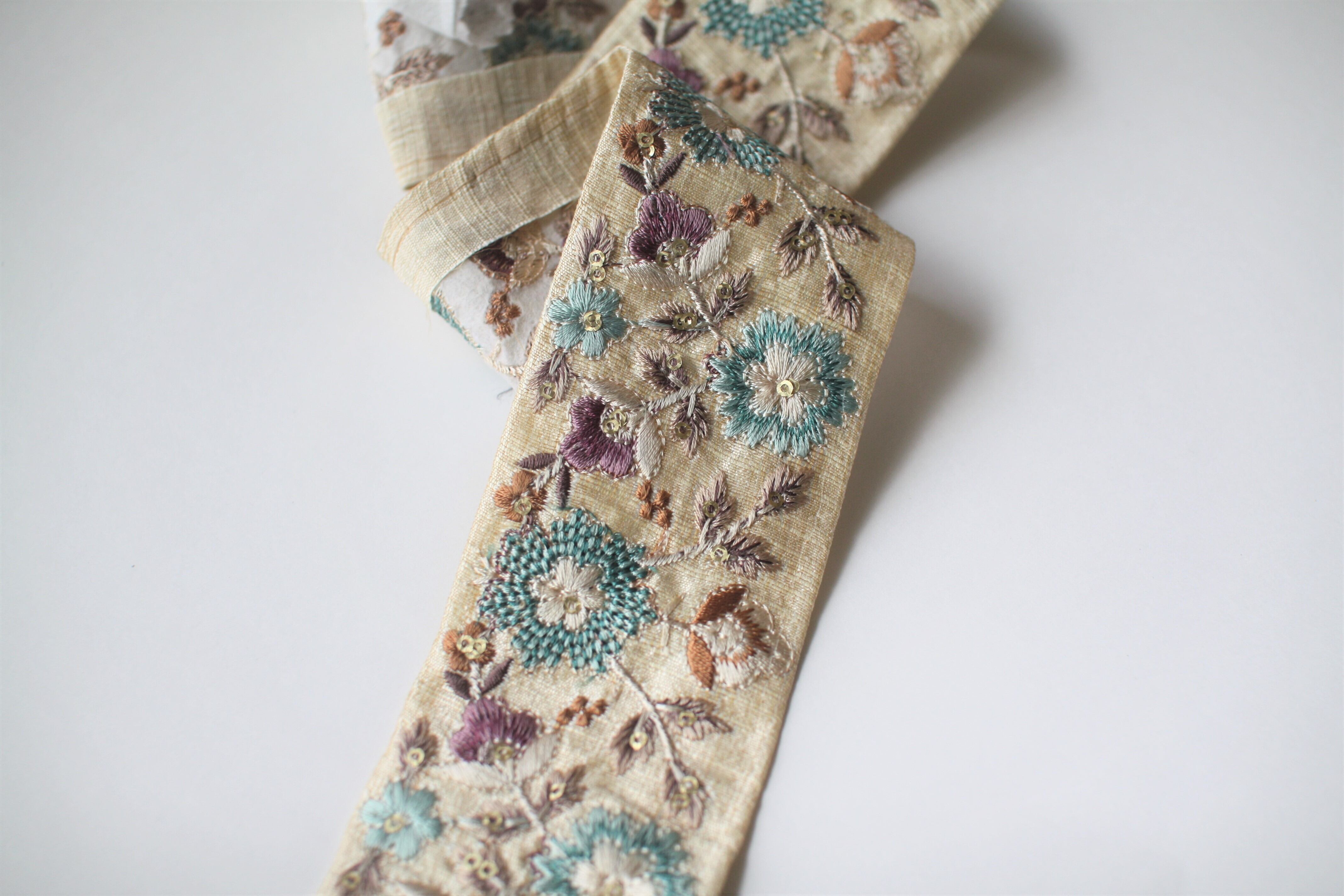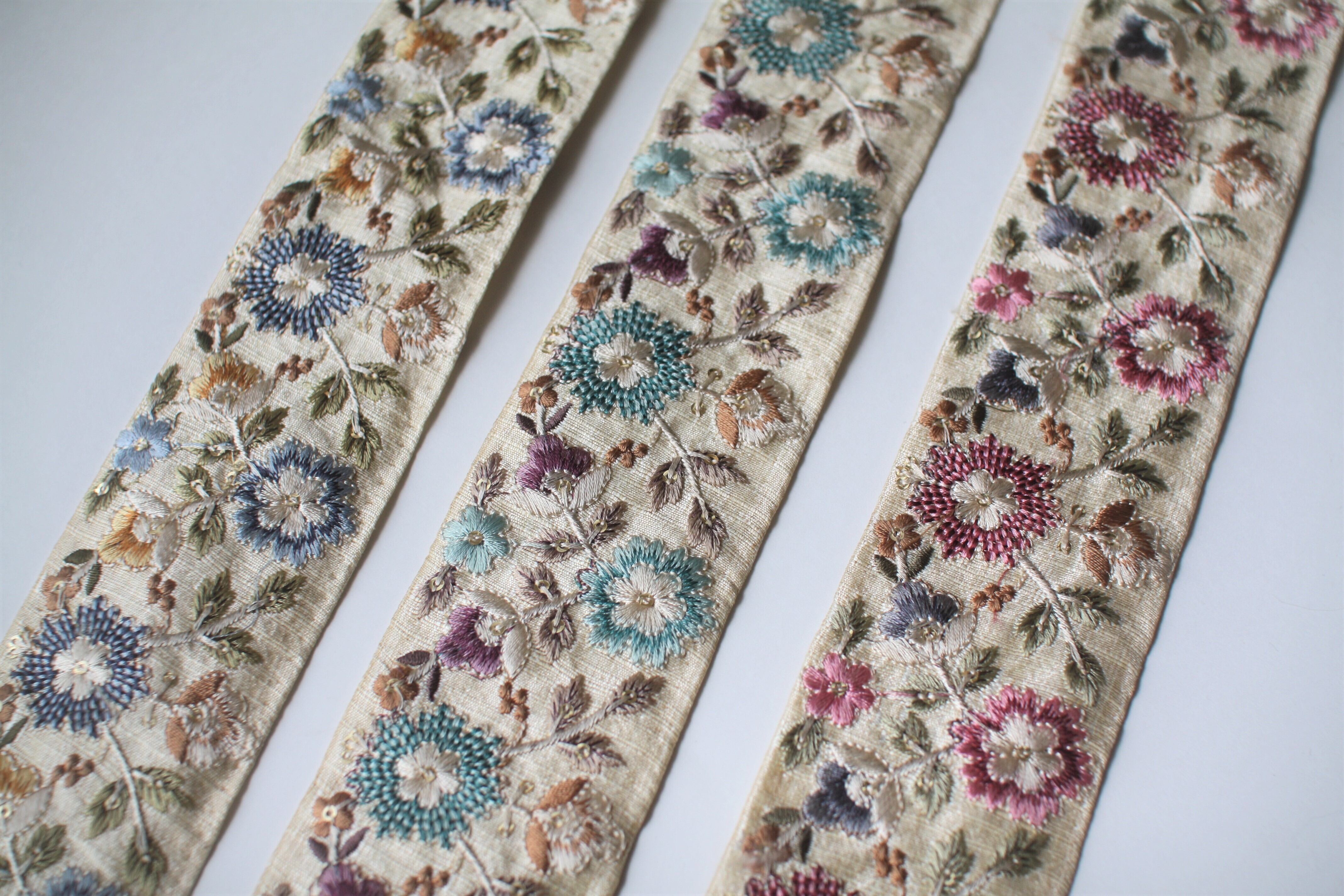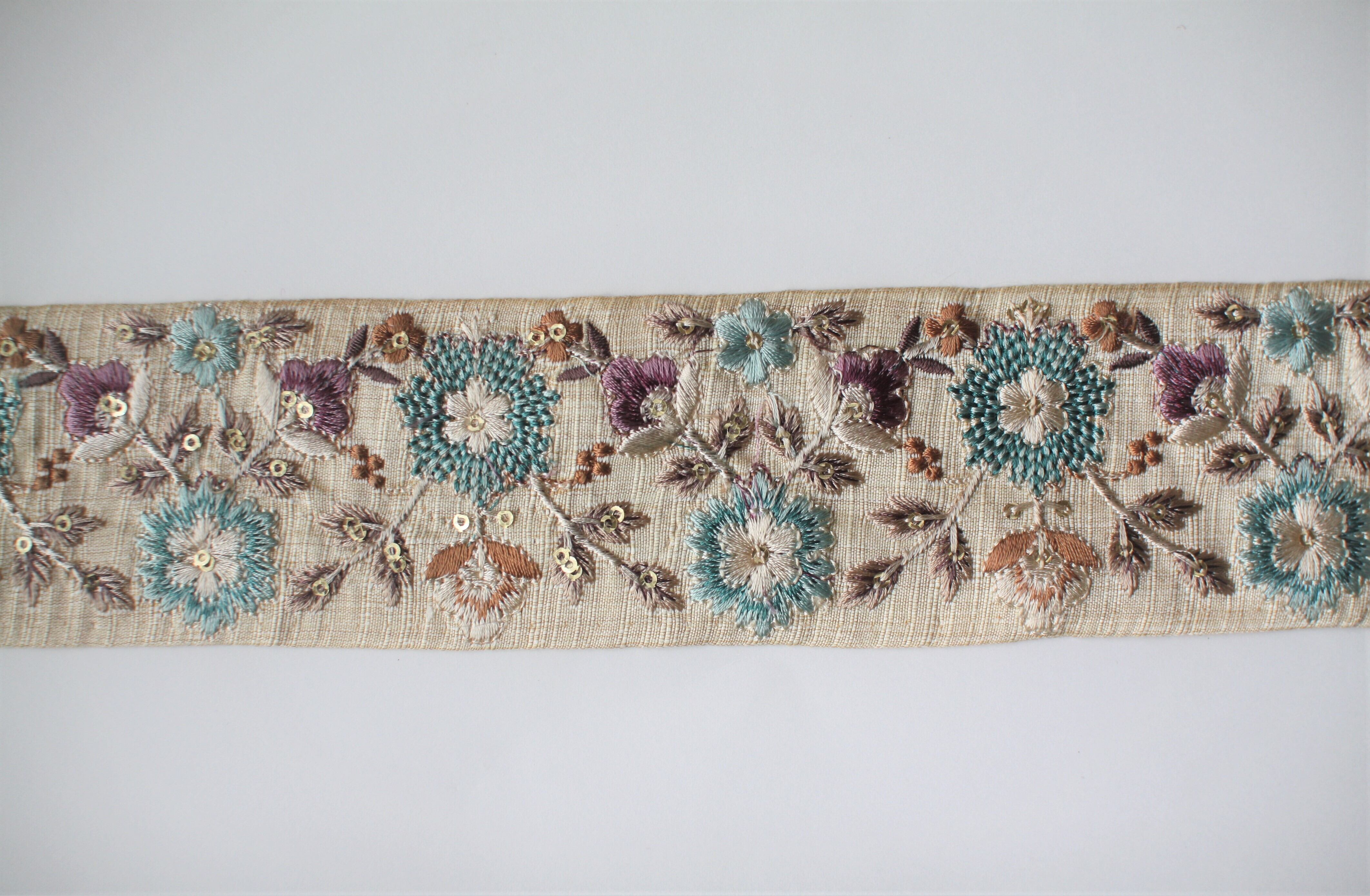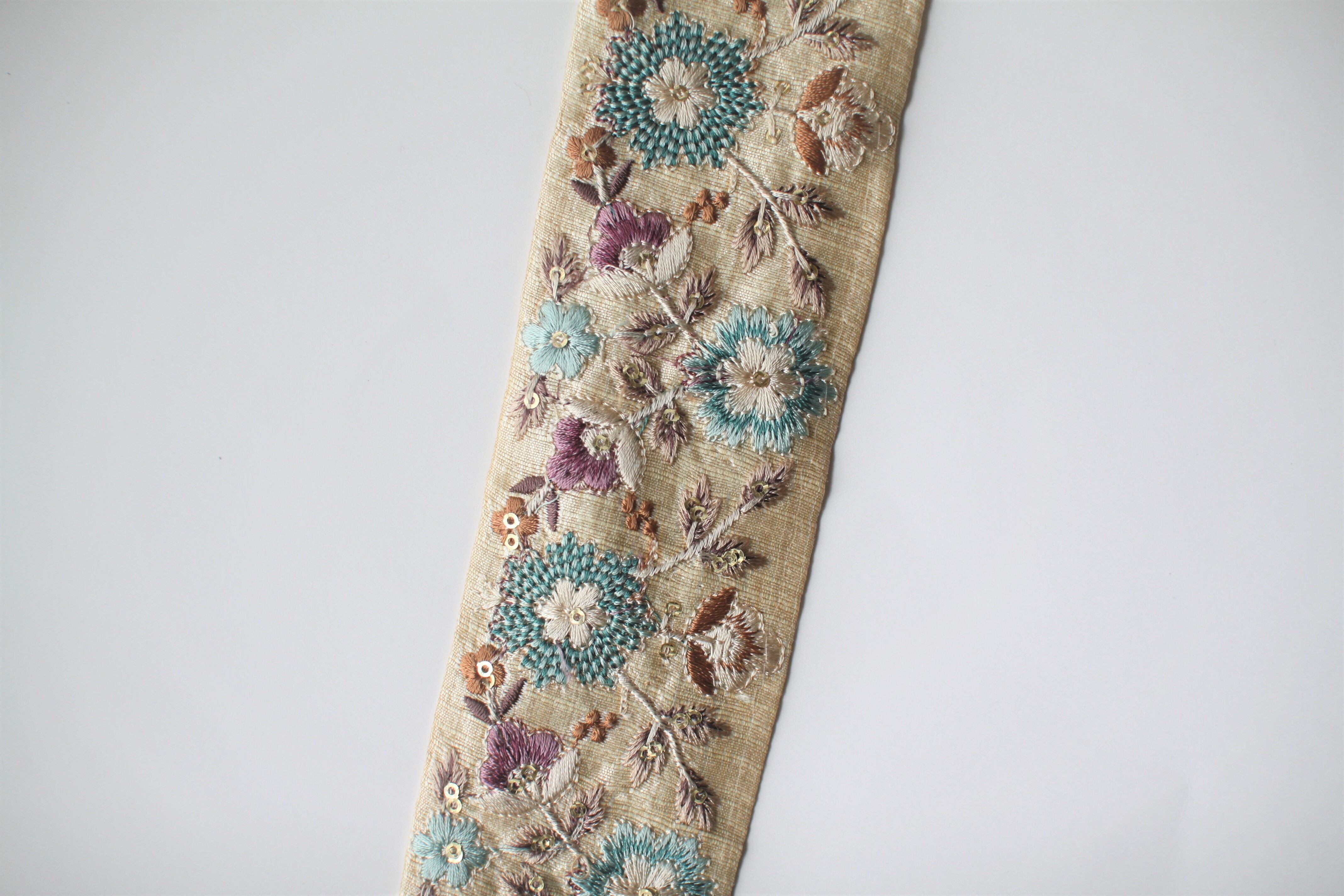 ◆1mカット済◆インド花柄刺繍リボン・ライトブルー