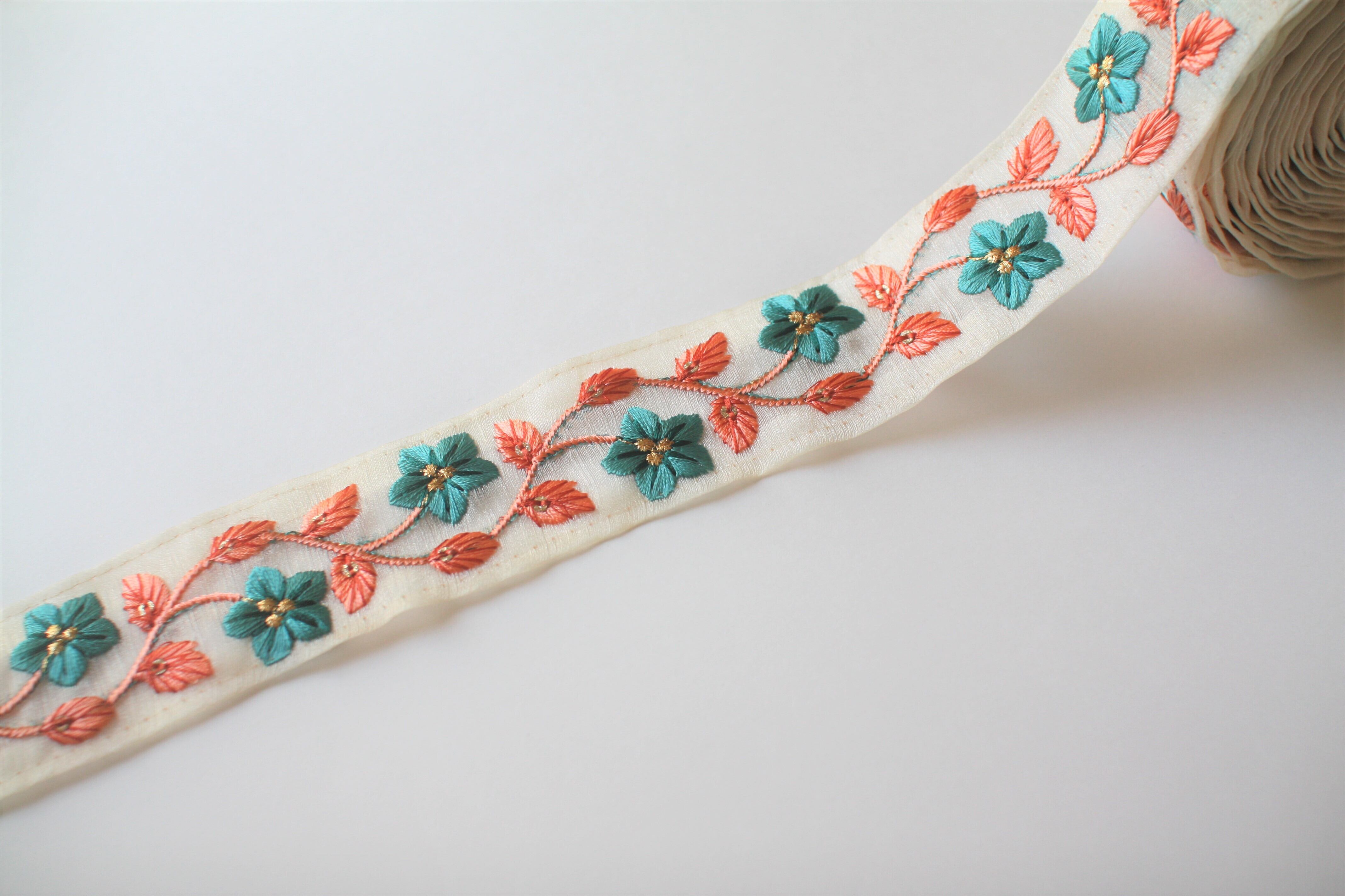 ◆1mカット済◆オーガンジー花柄刺繍リボン・オレンジ×グリーン