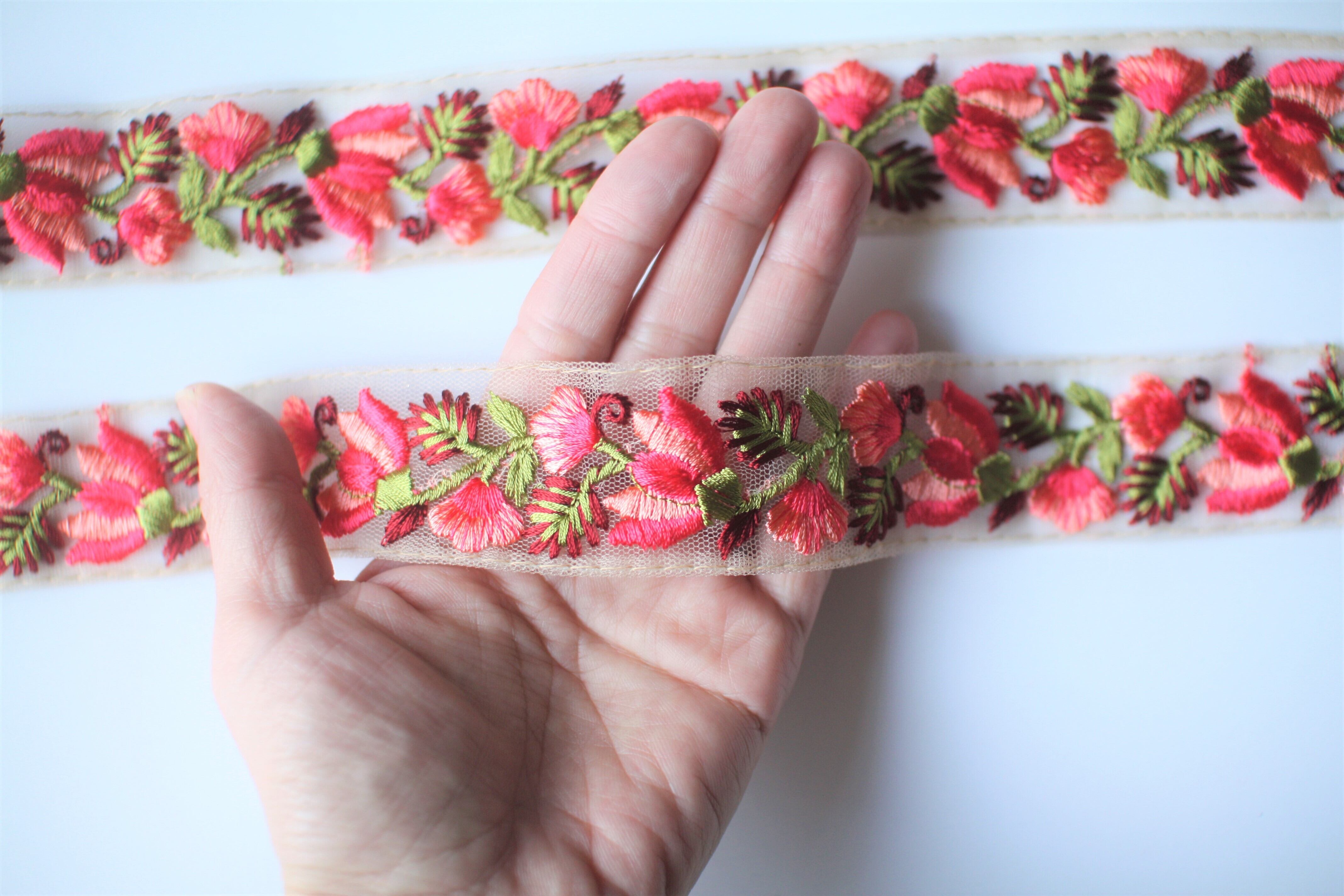 ◆60cmカット済◆チュール刺繍リボン・ピンク