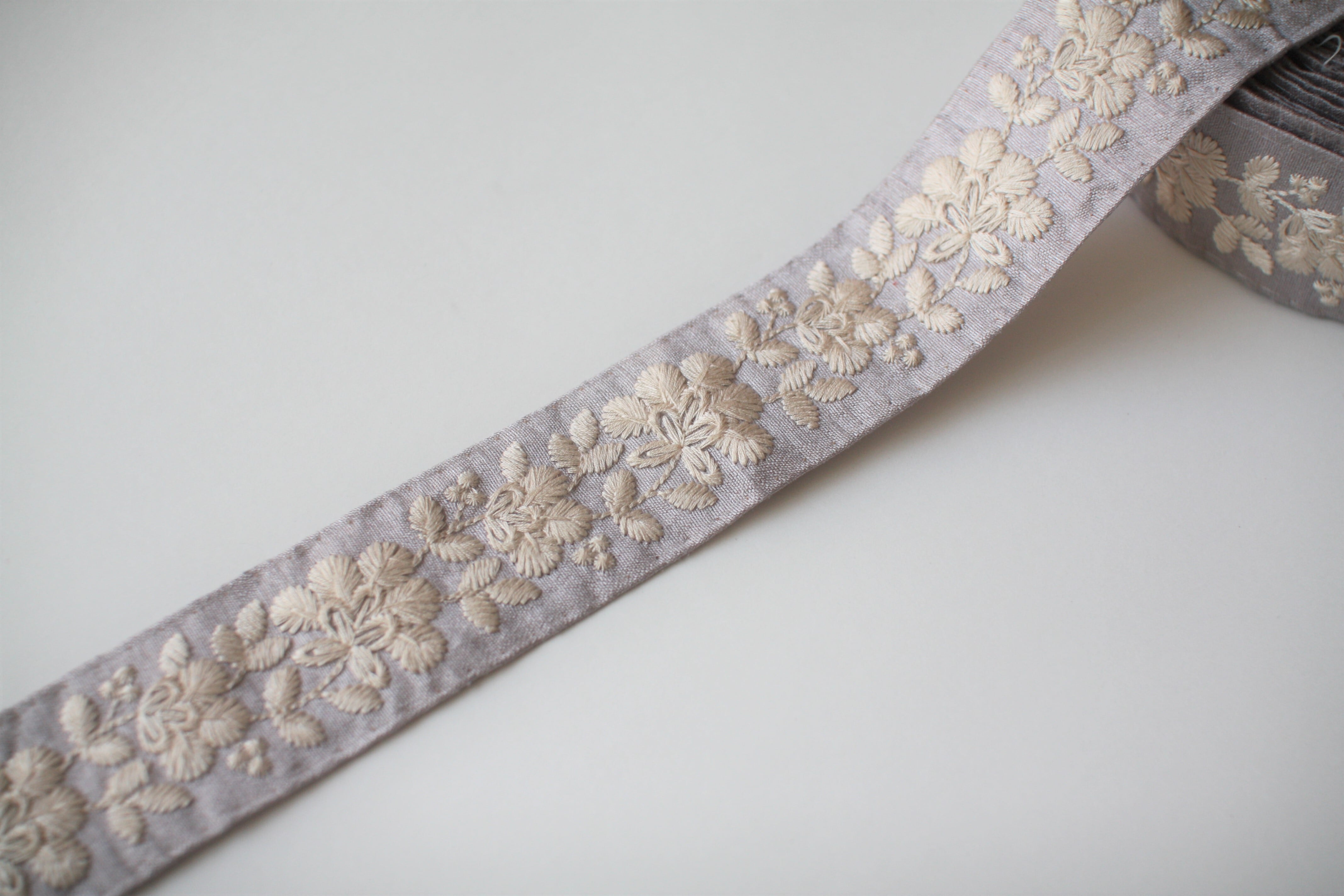 ◆1mカット済◆シルク花柄刺繍リボン・スカイグレイ