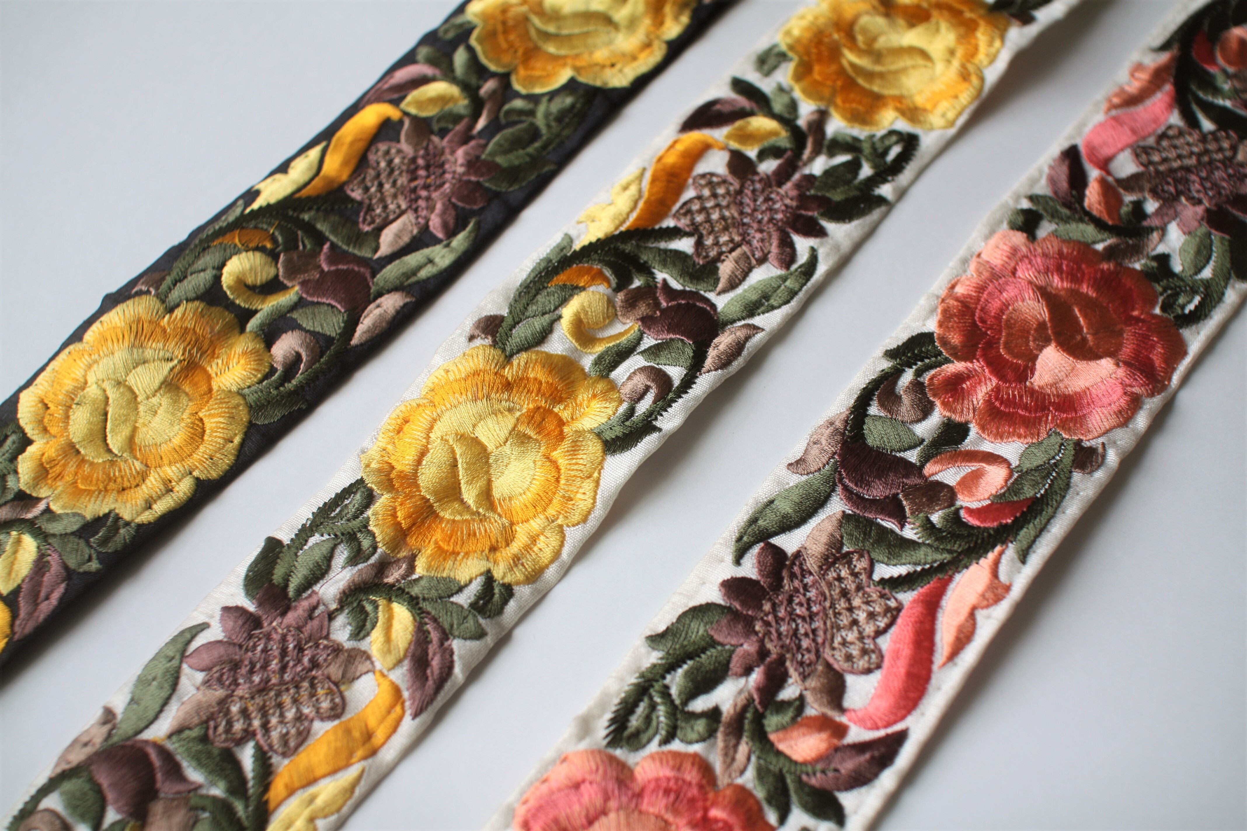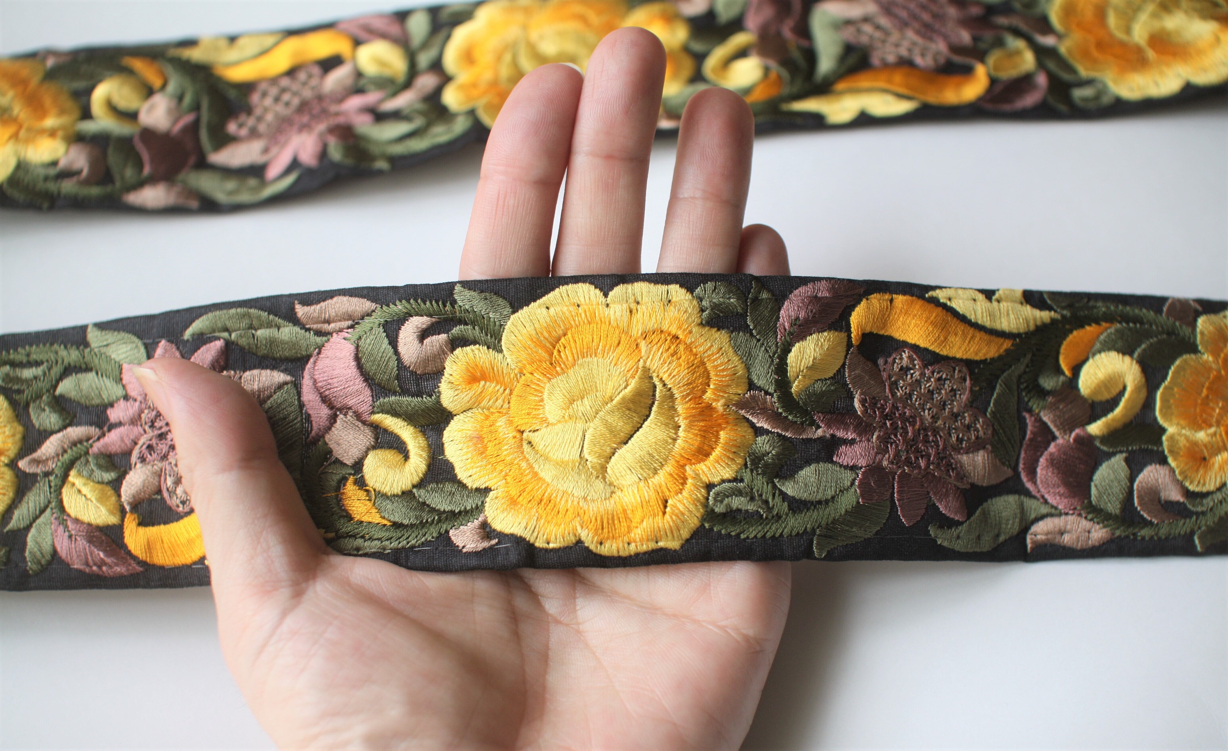 ◆1mカット済◆インド花柄刺繡リボン・ブラック×イエロー