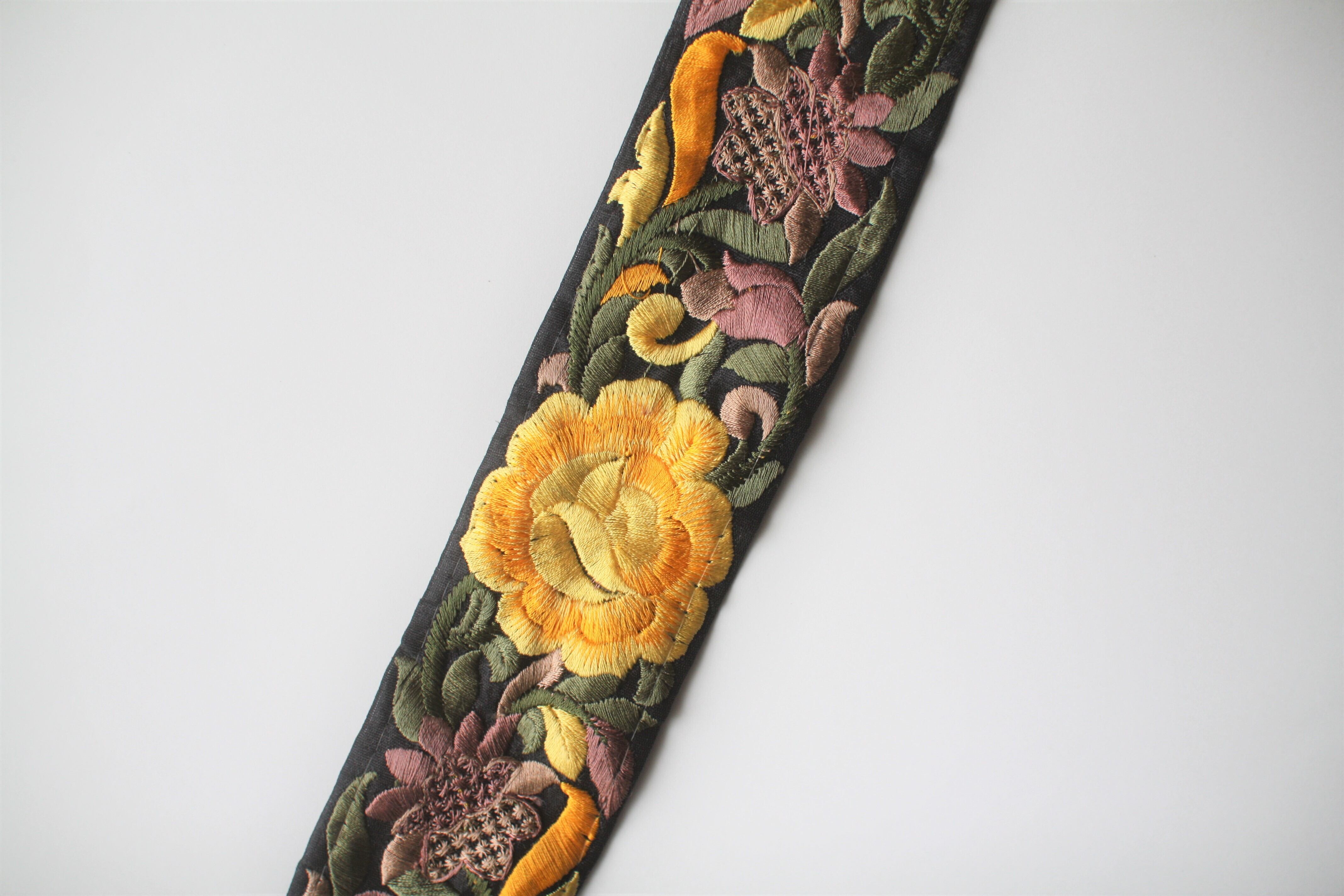 ◆95cmカット済◆インド花柄刺繡リボン・ブラック×イエロー