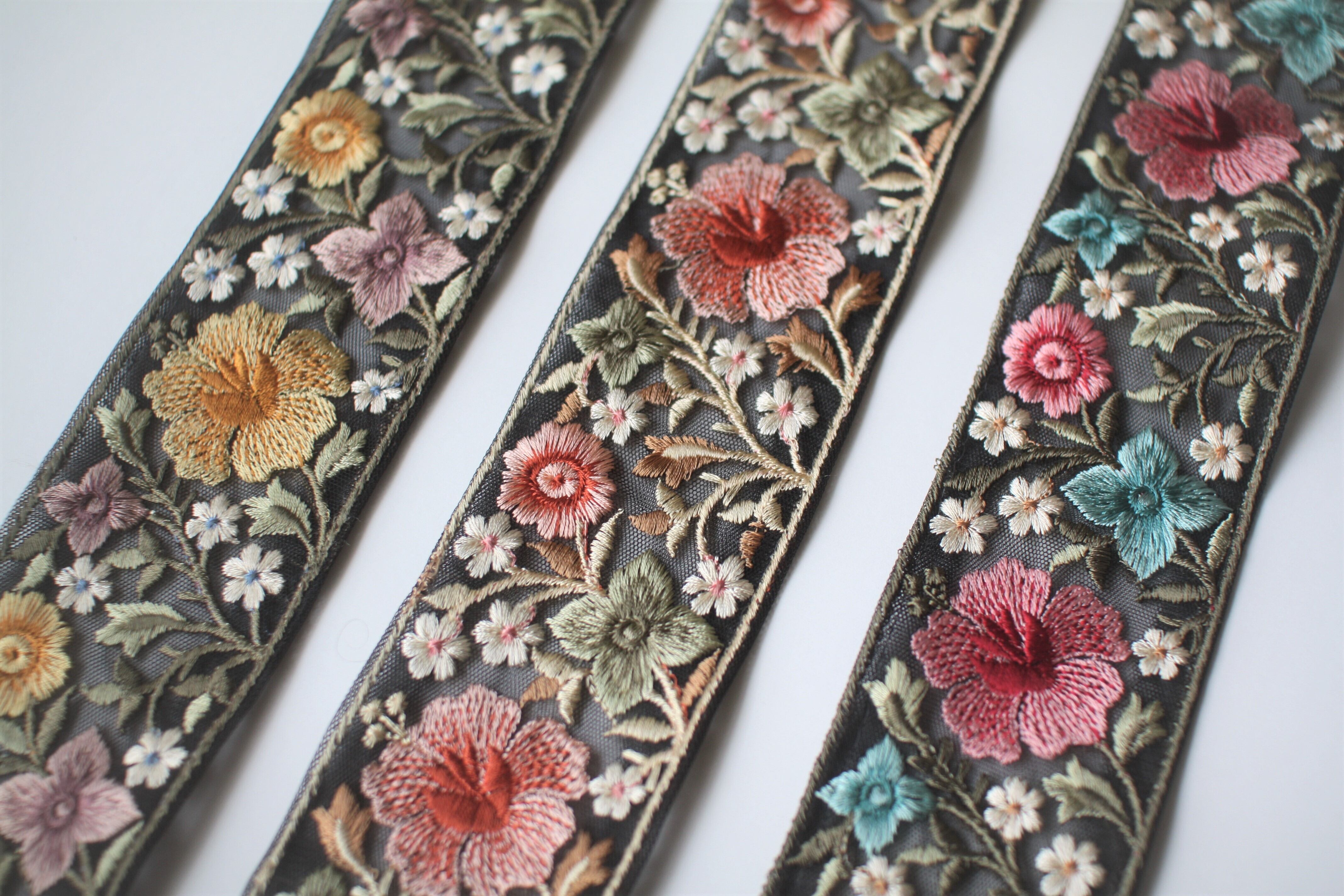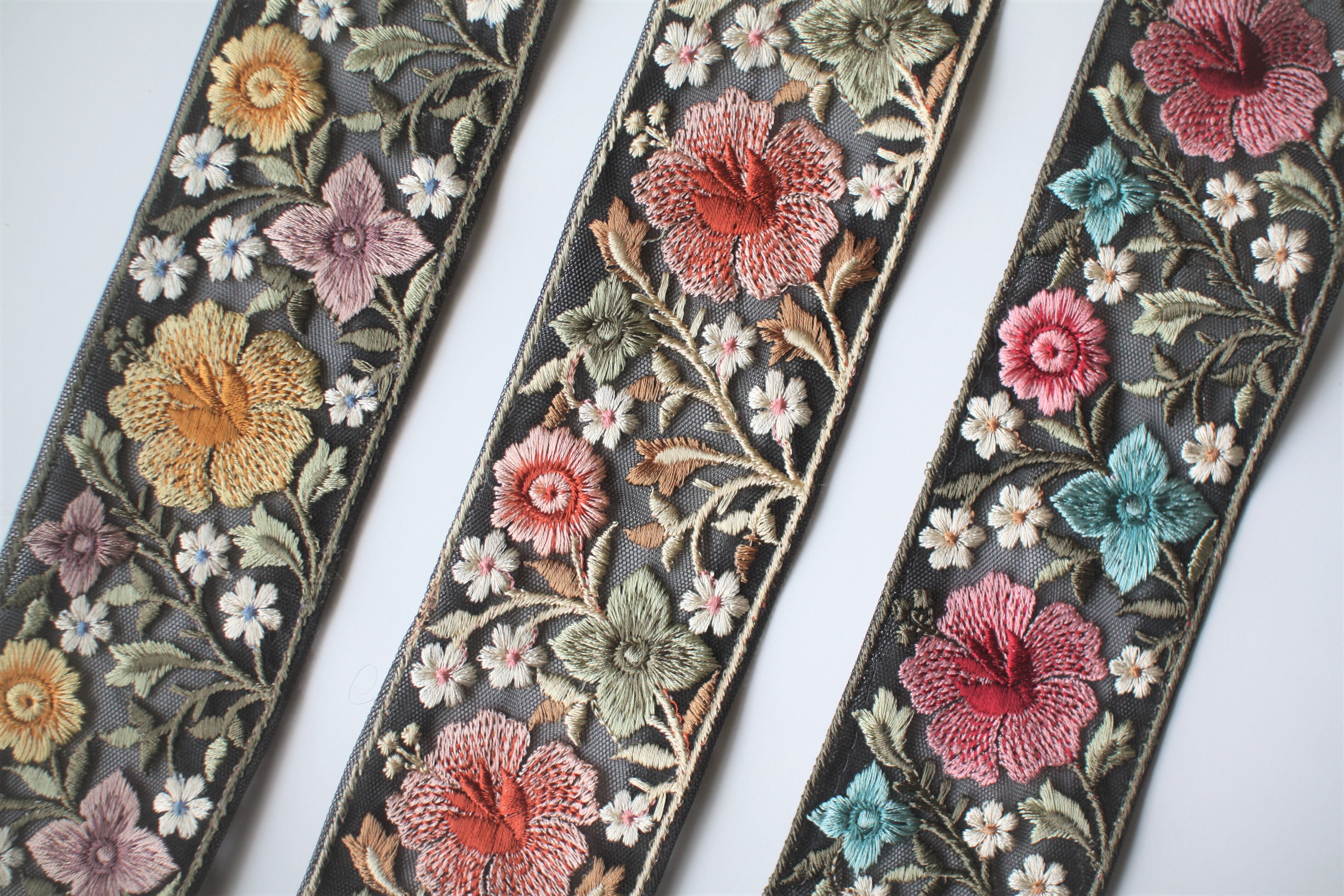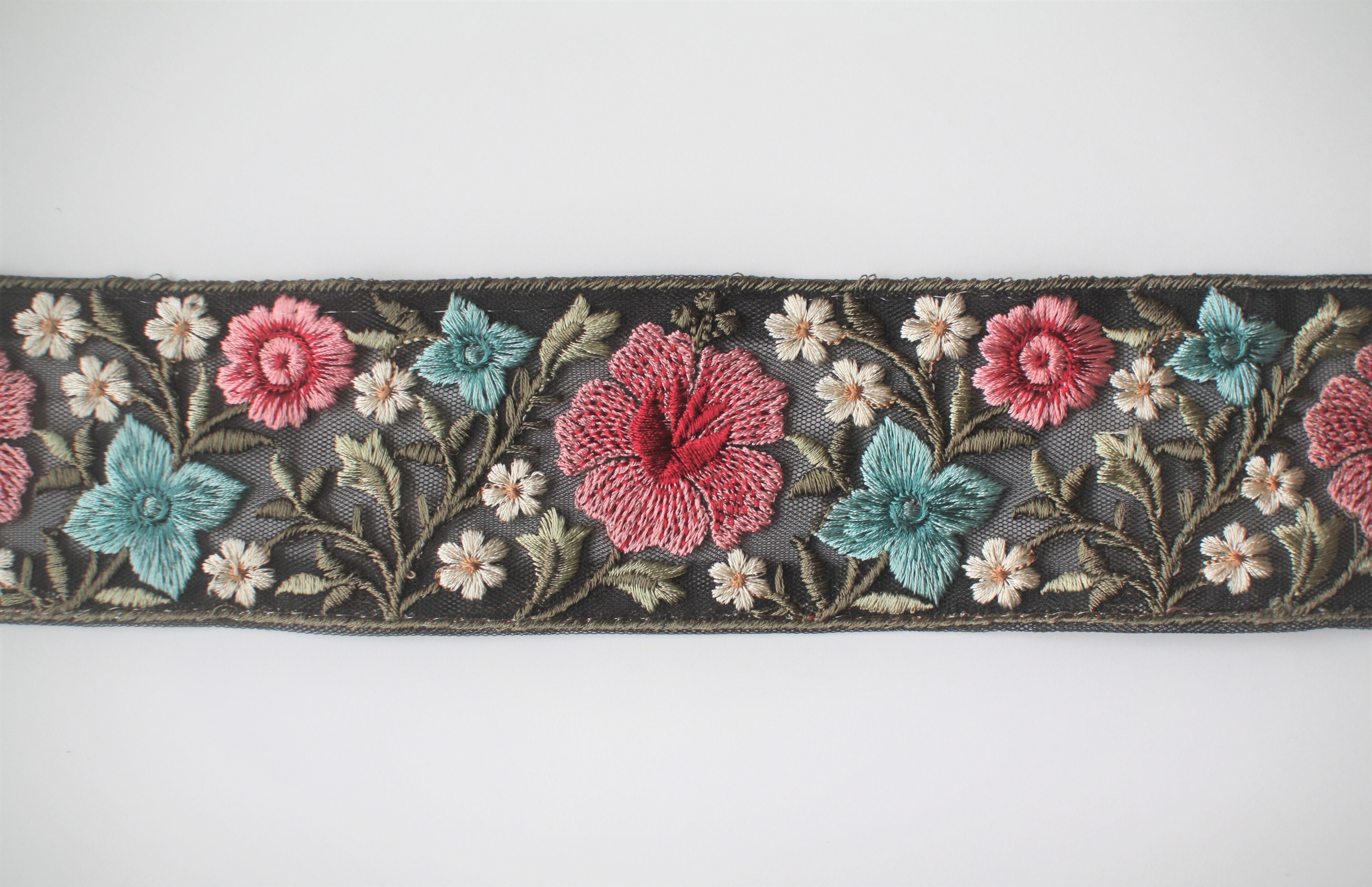 ◆1mカット済◆チュール花柄刺繍リボン・ブラック×レッド