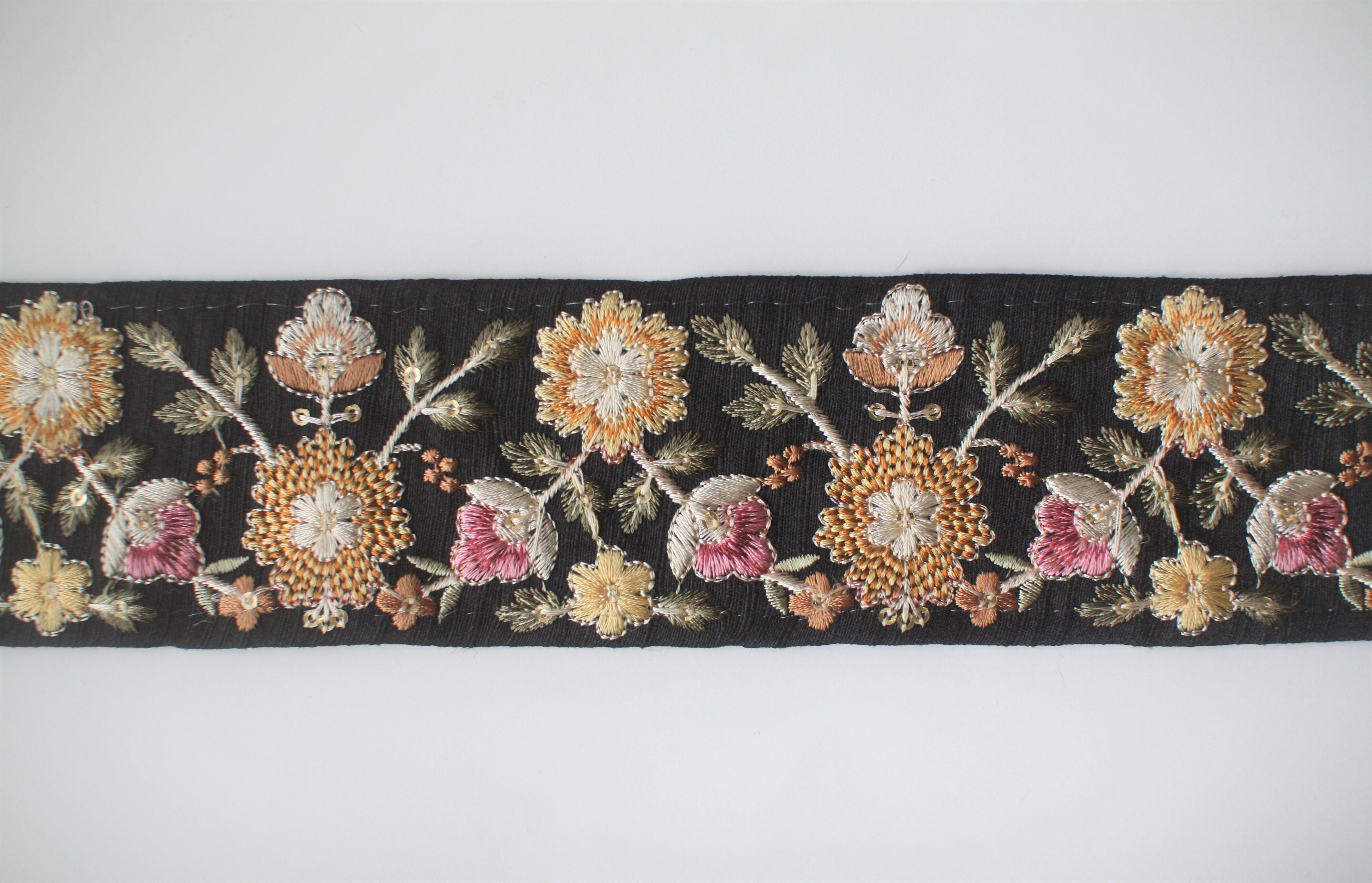 ◆1mカット済◆インド花柄刺繍リボン・ブラック×イエロー