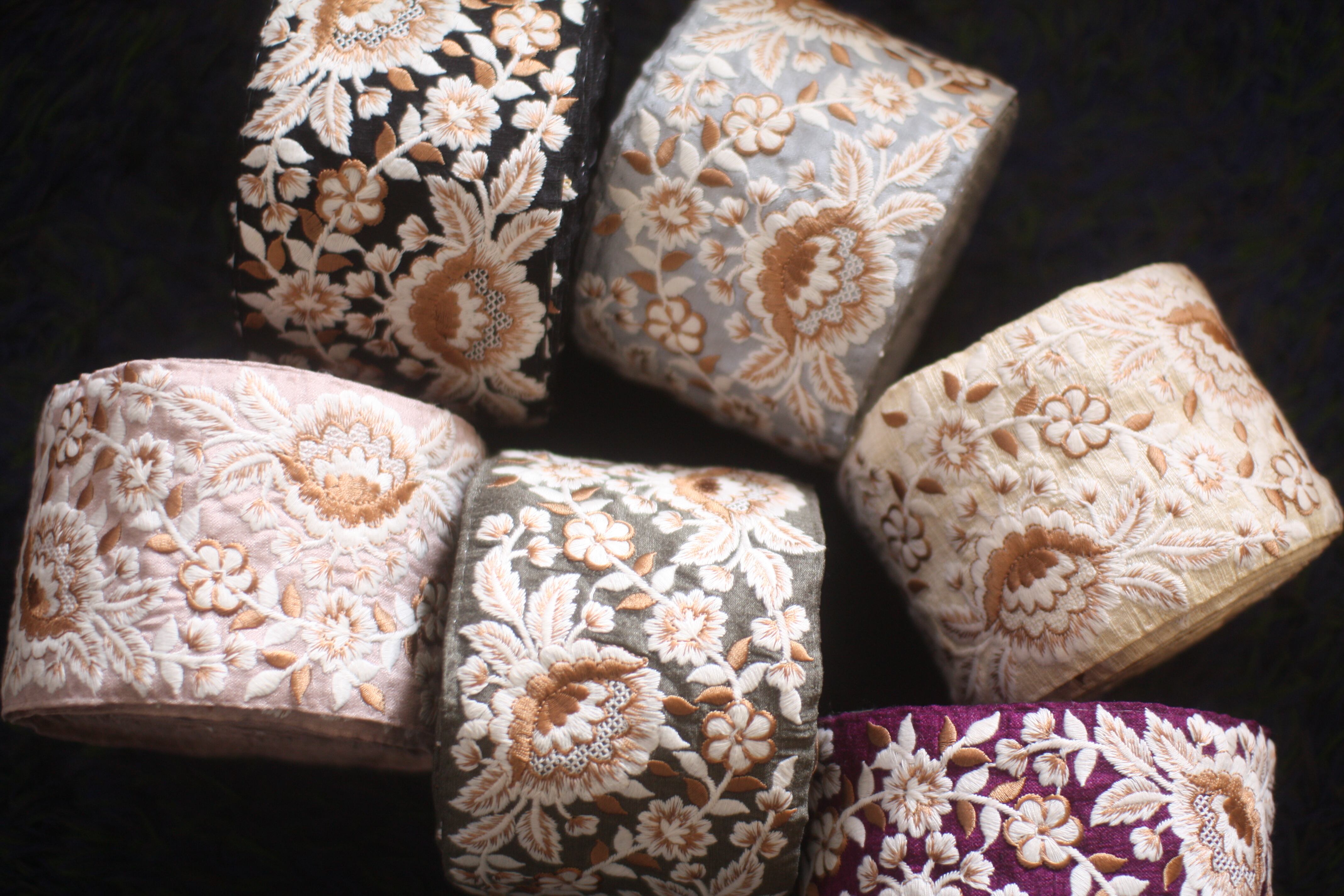◆55cmカット済◆インド花柄刺繍リボン・パープル