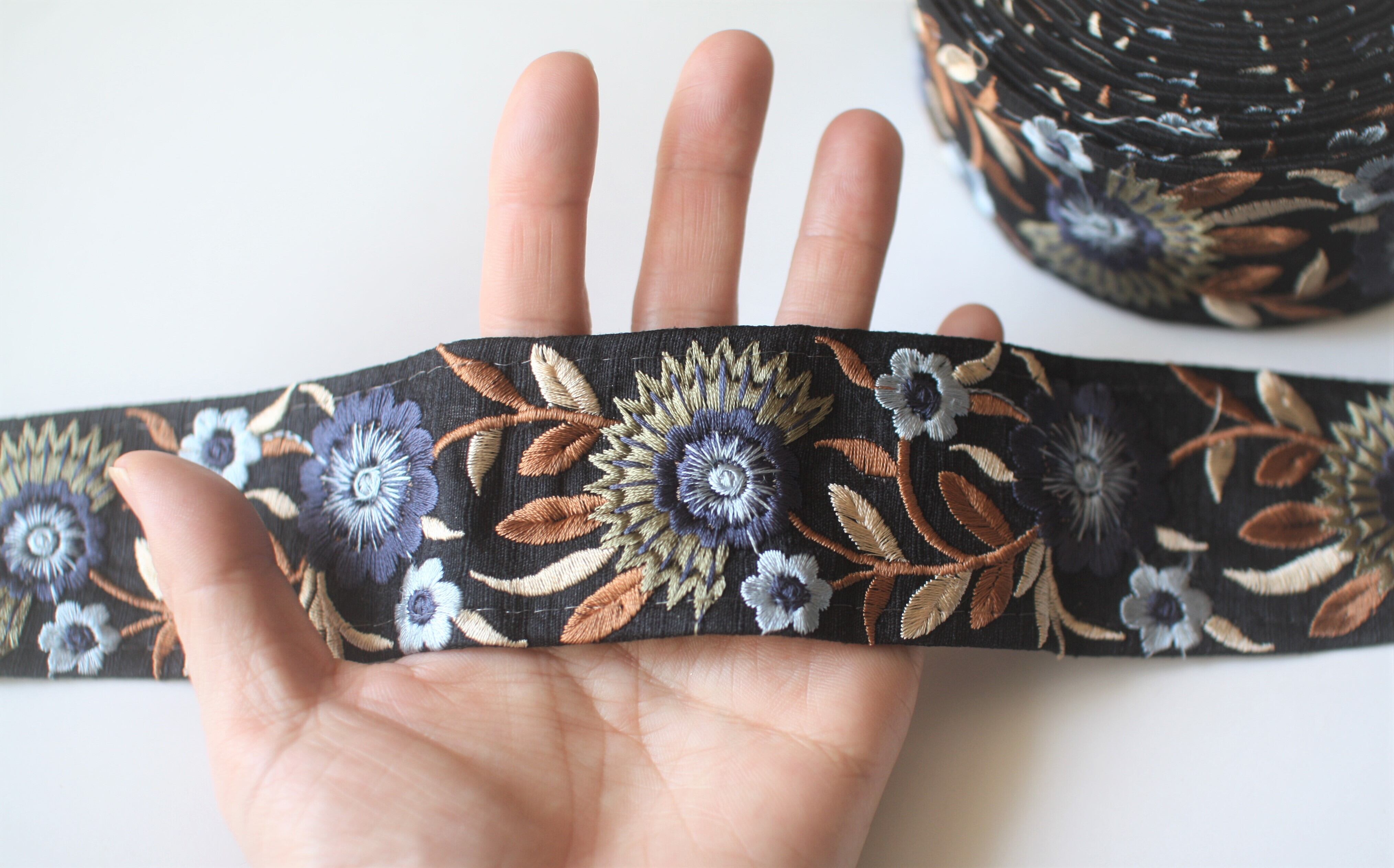 ◆1mカット済◆インド花柄刺繍リボン・ブルー