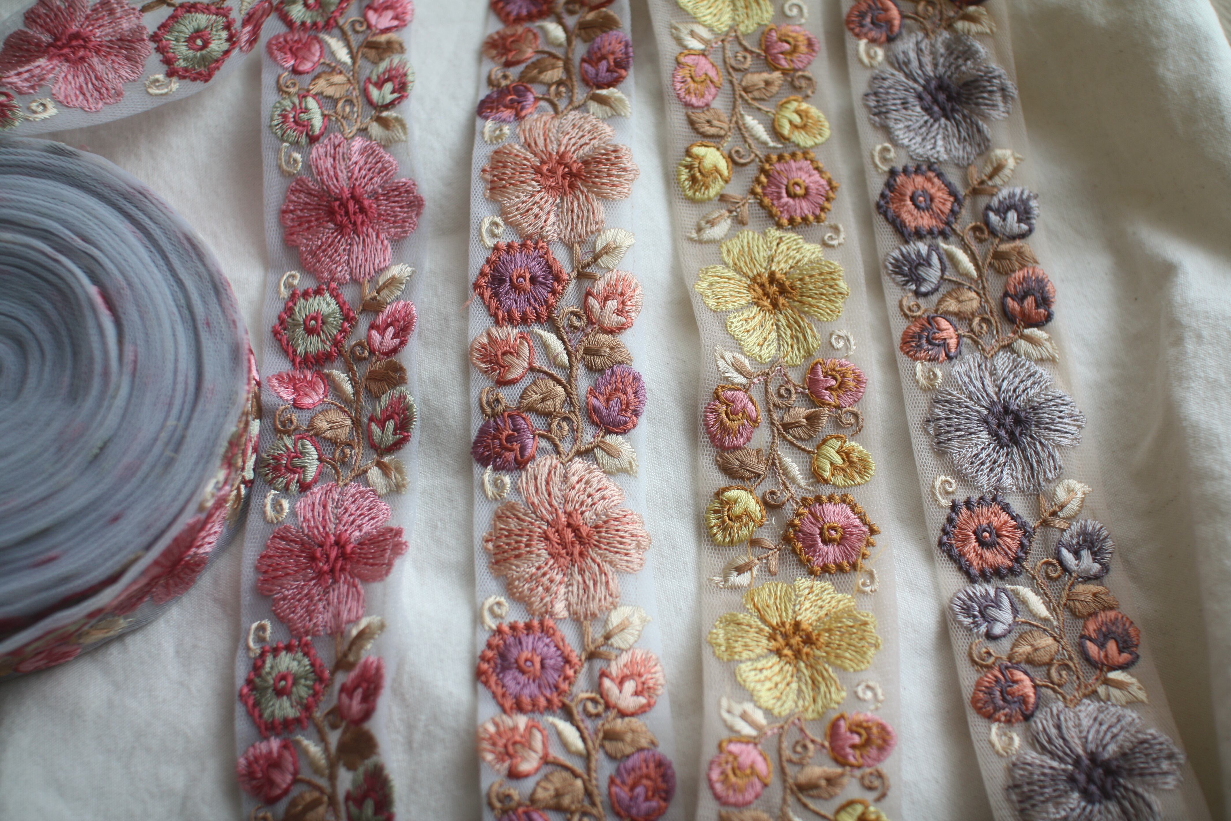 ◆1mカット済◆チュール花柄刺繍リボン・イエロー