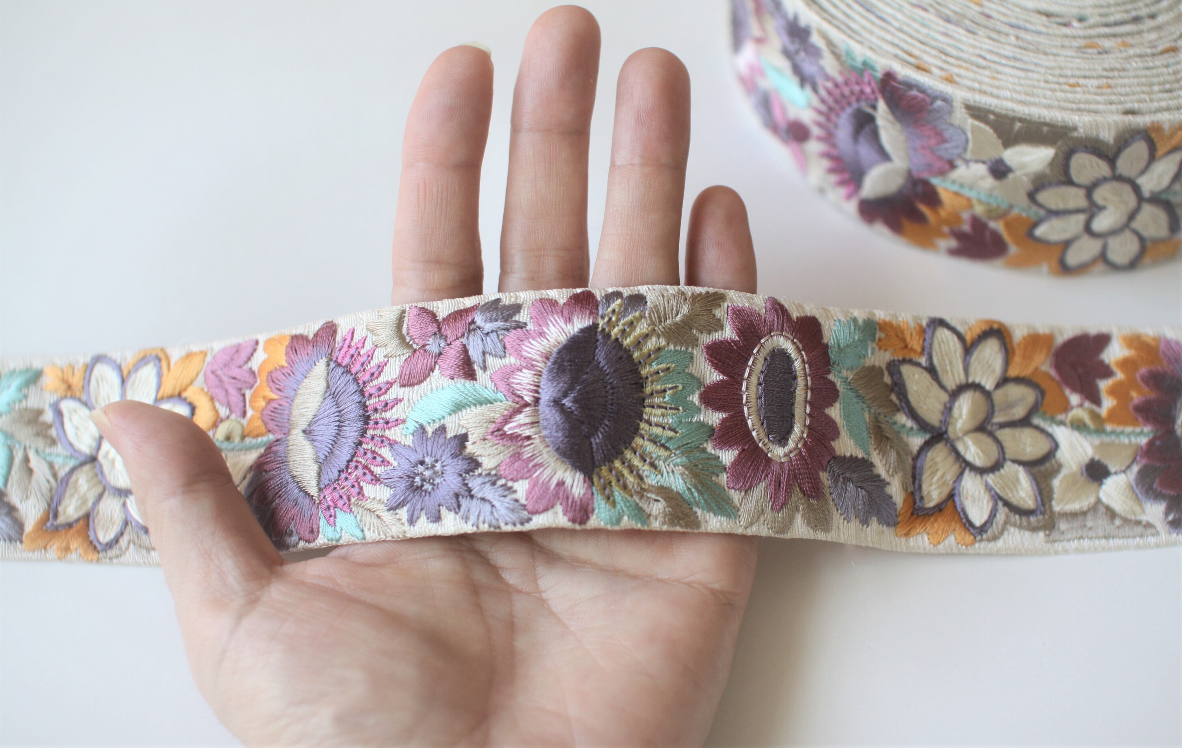 ◆1mカット済◆インド花柄刺繍リボン・パープル