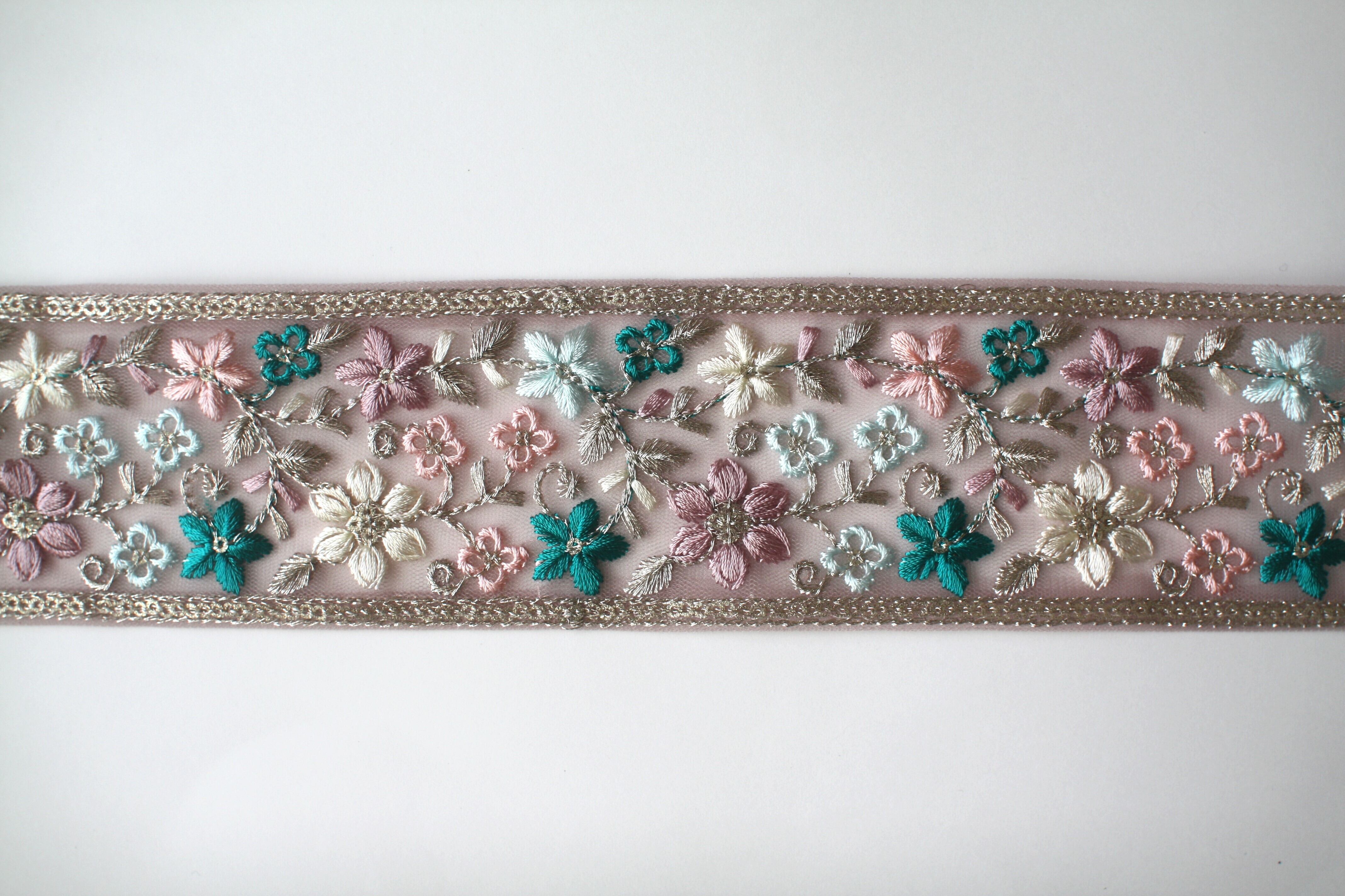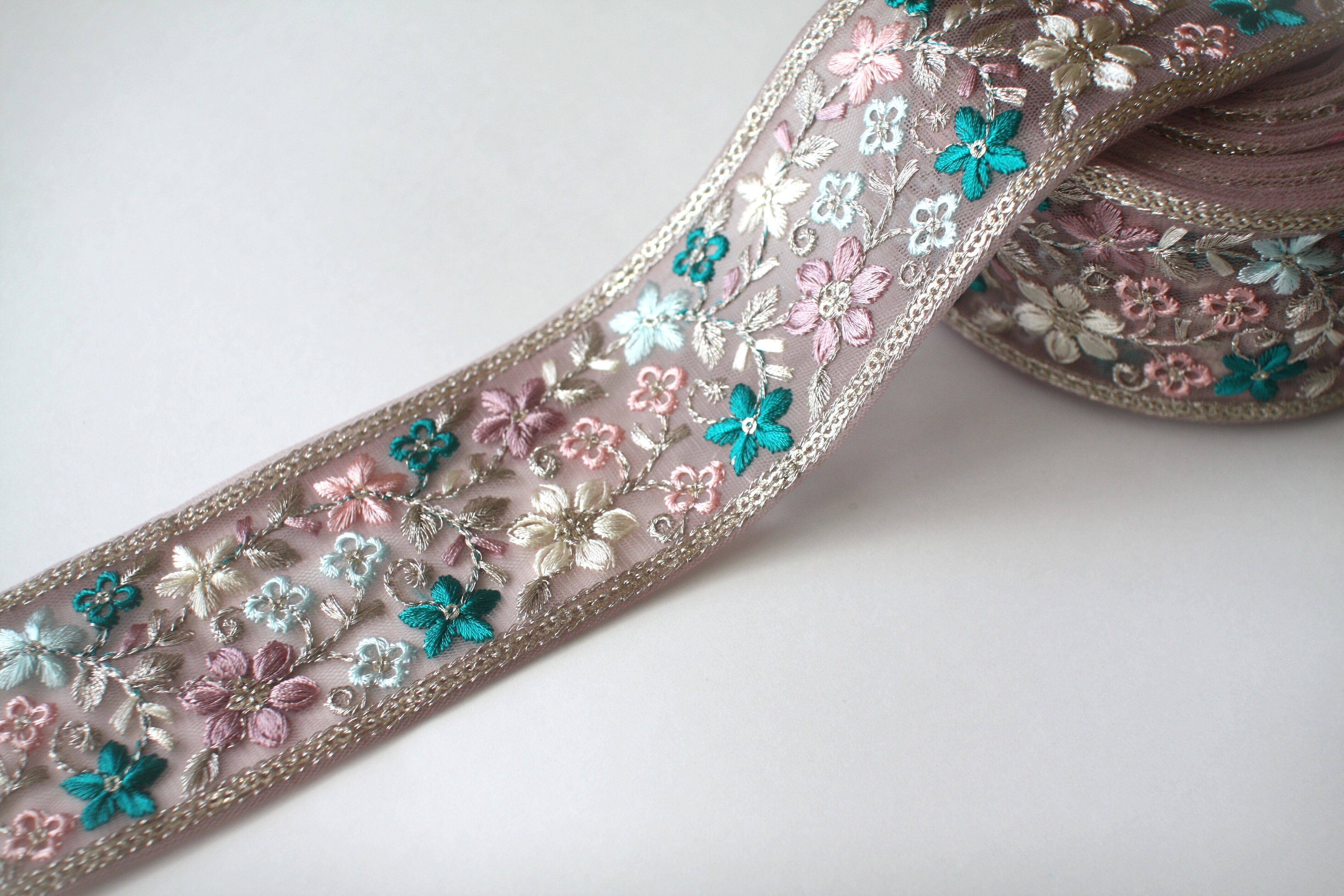 ◆1mカット済◆チュール花柄刺繍リボン・ピンク×ホワイト