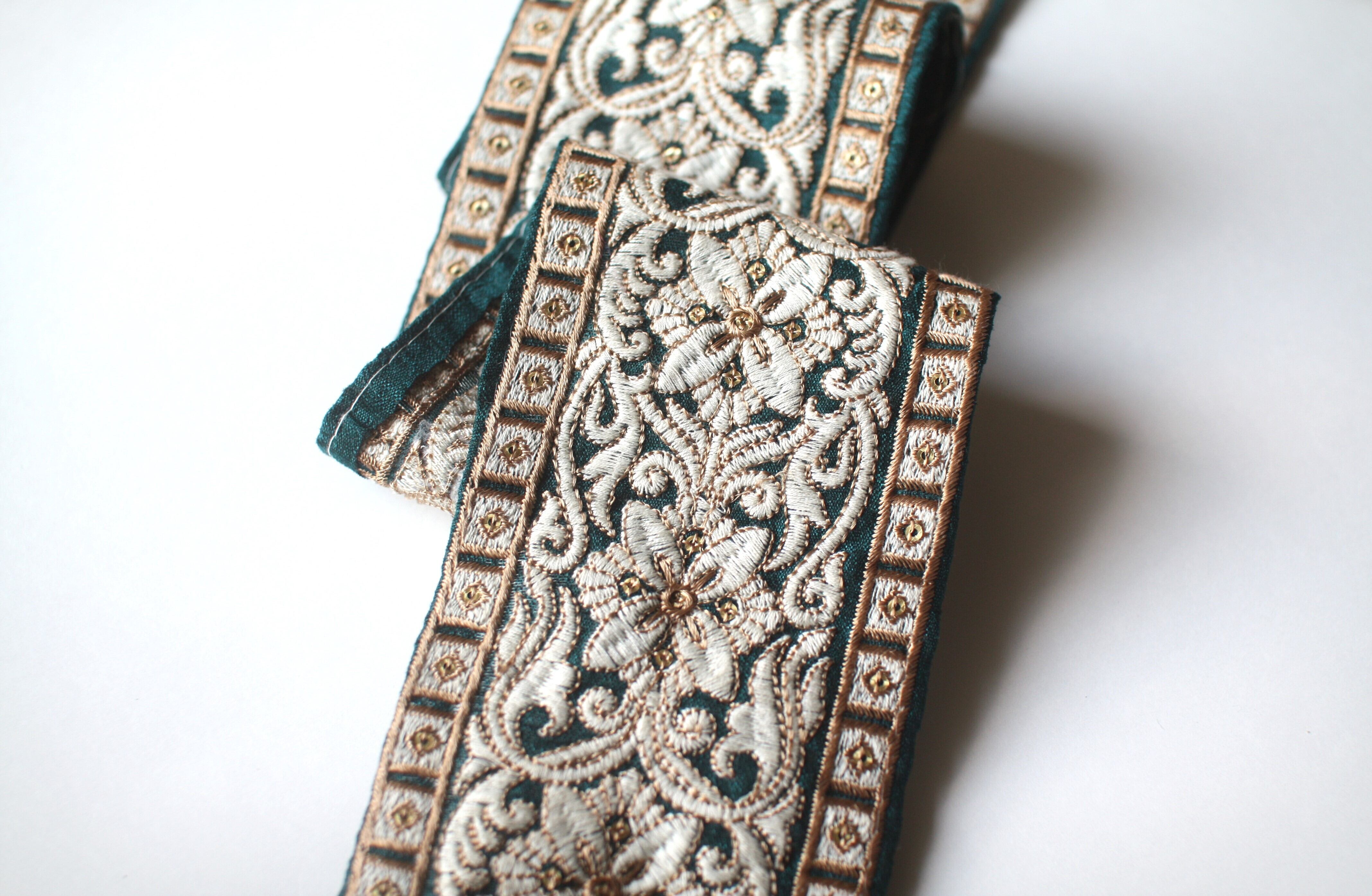 ◆90cmカット済◆インド花柄刺繍リボン・グリーン