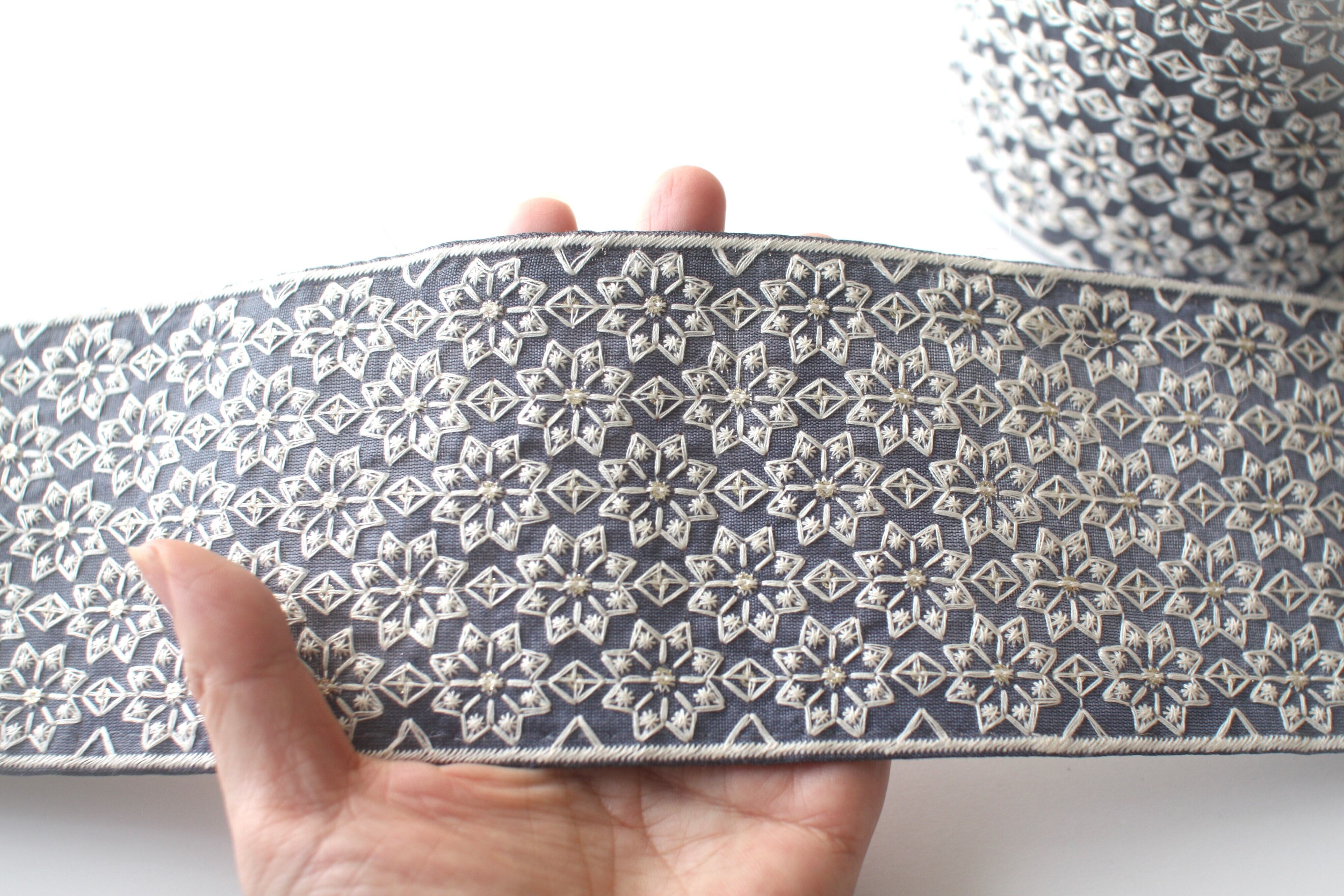 ◆1mカット済◆インド花柄刺繍リボン・グレー