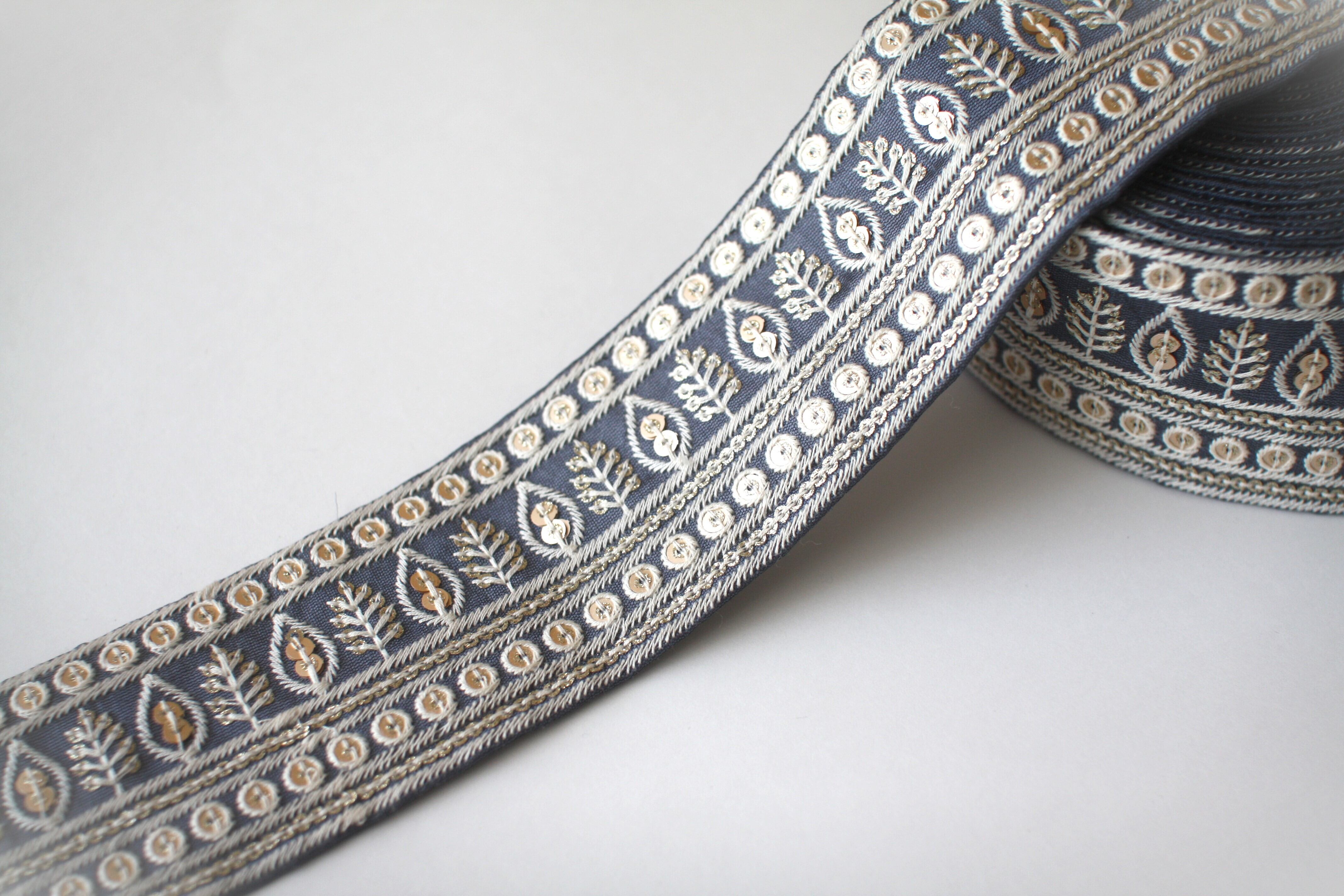 ◆1mカット済◆インド花柄刺繍リボン・グレー