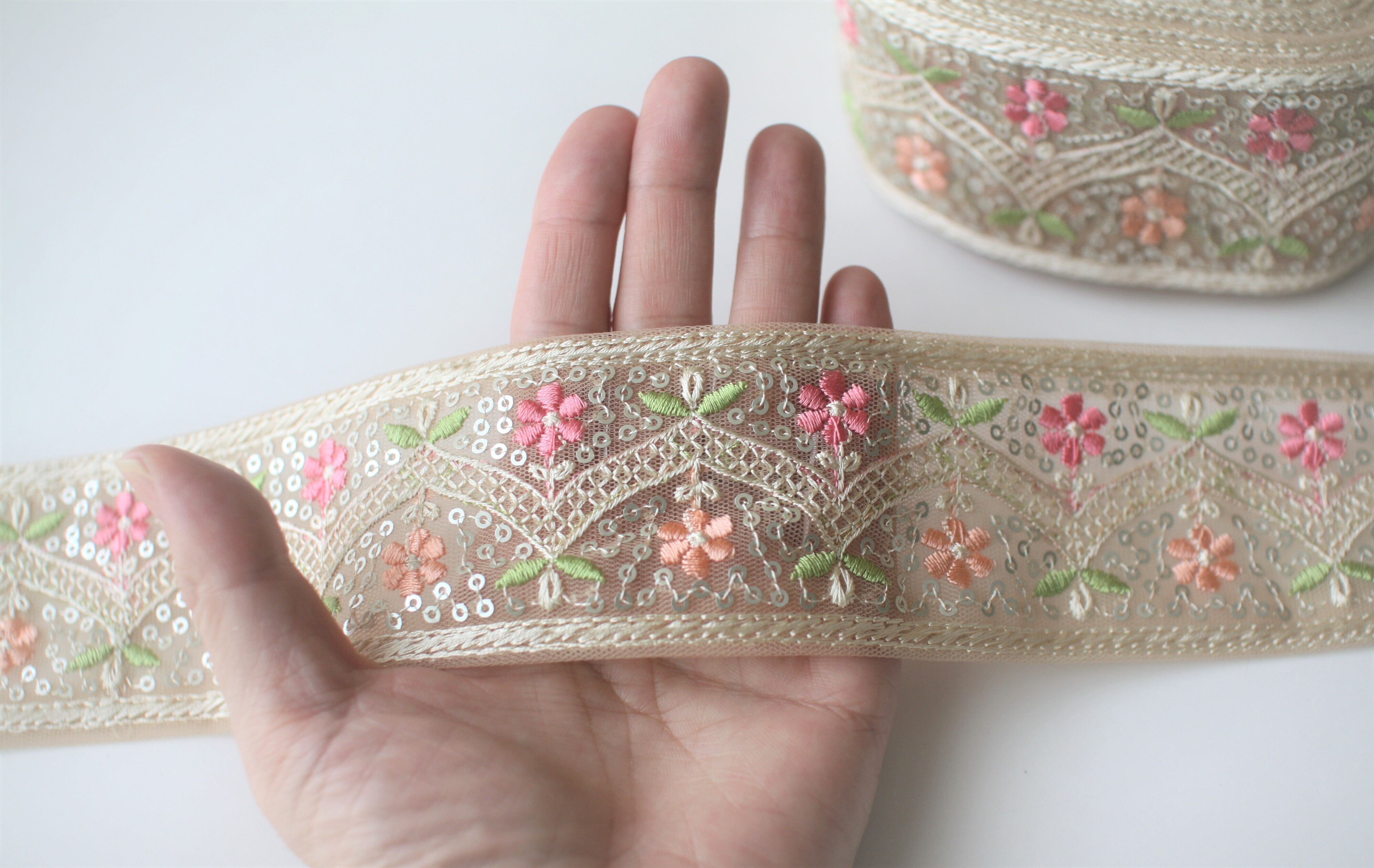 ◆90cmカット済◆チュール花柄刺繍リボン・ピンク×ピーチ