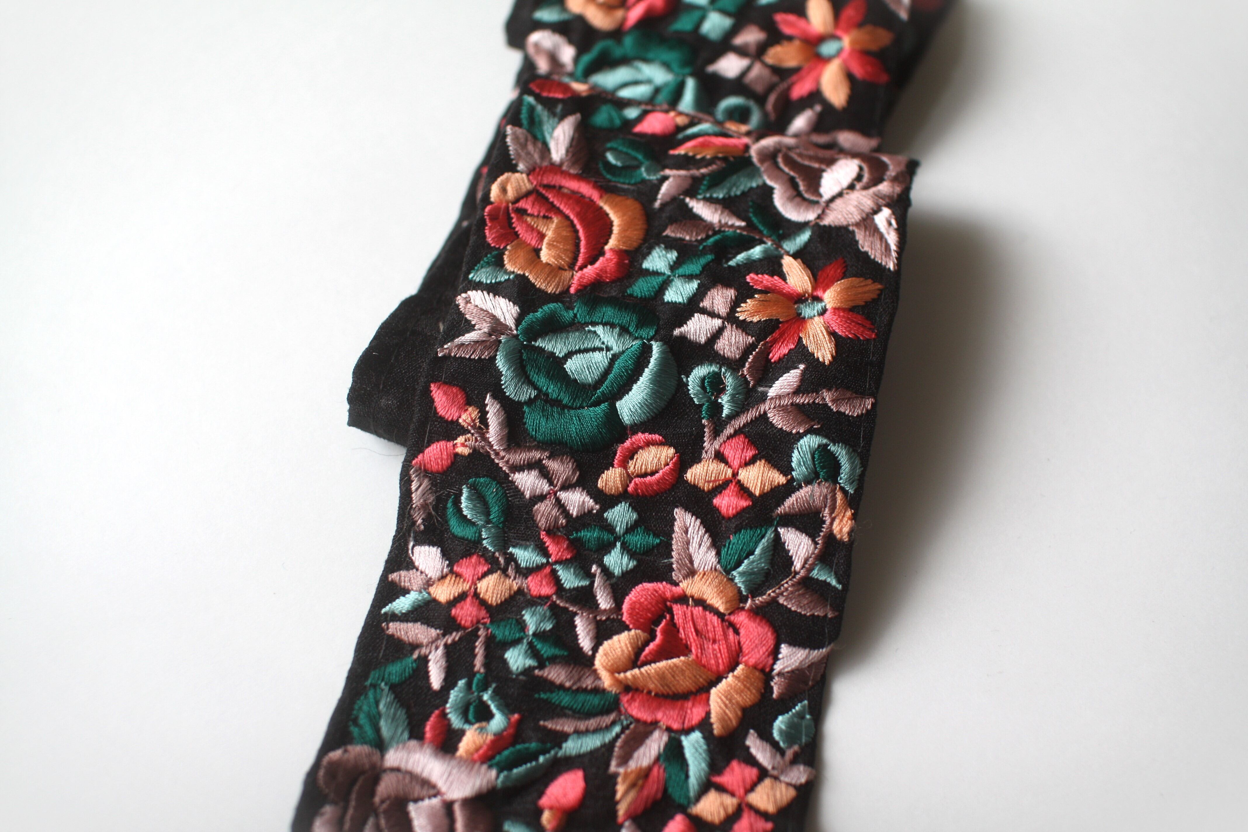 ◆80cmカット済◆インド花柄刺繍リボン・ブラック×ローズ